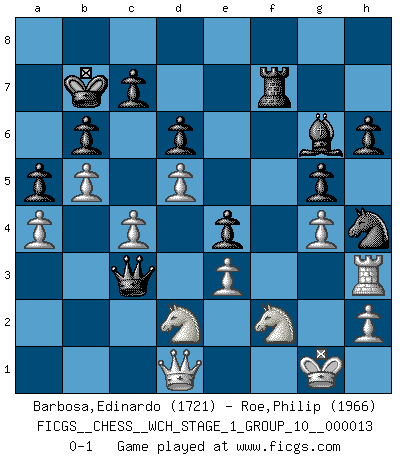Last move : 0-1 2014 August 6 0:3:52 [Event "FICGS__CHESS__WCH_STAGE_1_GROUP_10__000013"] [Site "FICGS"] [Date "2014.03.03"] [Round "1"] [White "Barbosa,Edinardo"] [Black "Roe,Philip"] [Result "0-1"] [WhiteElo "1721"] [BlackElo "1966"] 1.d4 Nf6 2.c4 Nc6 3.Nc3 e5 4.d5 Ne7 5.e4 Ng6 6.Nf3 Bc5 7.Bd3 O-O 8.O-O d6 9.Bg5 h6 10.Bd2 a6 11.a3 Nh5 12.b4 Ba7 13.Ne1 Nhf4 14.Rc1 Qe7 15.Be3 Bxe3 16.fxe3 Nxd3 17.Nxd3 a5 18.b5 Qg5 19.Qe1 b6 20.Rf3 Nh4 21.Rg3 Qh5 22.Rc2 g5 23.Rf2 f5 24.exf5 Nxf5 25.Rh3 Qe8 26.g4 Nh4 27.Qe2 Bd7 28.Rxf8+ Qxf8 29.Nf2 Qf7 30.Rg3 Rf8 31.Nfe4 Qh7 32.Nf2 Be8 33.Nce4 Bg6 34.Nd2 e4 35.a4 Qh8 36.Qd1 Qe5 37.Rh3 Rf7 38.Qc1 Kf8 39.Rg3 Ke8 40.Rh3 Kd8 41.Rg3 Kc8 42.Qd1 Qc3 43.Rh3 Kb7 0-1 Kevitz-Trajkovich defense Kingside Castling by player Black (move 7) Kingside Castling by player White (move 8) Player Black won this chess game. Follow this game move after move (download)I played Chess with him and would have beaten him sometimes only he always took back his last move, and ran the game out differently. (Mark Twain) Im Schach nämlich geht es darum, daß Ich des Gegners klein zu kriegen, sein Ego zu zerbrechen und zu zermahlen, seine Selbstachtung zu zertreten und zu verscharren und seine ganze mißachtenswerte sogenannte Persönlichkeit ein für alle Mal tot zu hacken und zu zerstampfen und dadurch die menschliche Gesellschaft von einer stinkenden Pestbeule zu befreien. Es ist ein königliches Spiel. (Robert James Fischer) El Ajedrez es tan interesante por sí solo, que no es necesario un interés monetario para persuadir a una persona a que lo practique; por lo tanto, nunca se juega por dinero. (Benjamin Franklin) La conception d'un plan est le processus par lequel un joueur exploite les avantages de sa position tout en s'efforçant d'en réduire au minimum les inconvénients. Afin de garantir le succès, un plan doit toujours se fonder sur un diagnostic objectif des particularités d'une position. La conception d'un plan est d'autant plus difficile que la position est équilibrée, et grandement facilitée lorsqu'il n'existe qu'un seul plan susceptible de répondre aux exigences de la position. (Harry Golombek) Man is still the most extraordinary computer of all. (John F. Kennedy)
