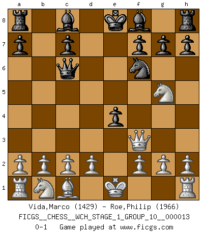 Last move : 0-1 2014 April 12 19:46:30 [Event "FICGS__CHESS__WCH_STAGE_1_GROUP_10__000013"] [Site "FICGS"] [Date "2014.03.03"] [Round "1"] [White "Vida,Marco"] [Black "Roe,Philip"] [Result "0-1"] [WhiteElo "1429"] [BlackElo "1966"] 1.e4 e5 2.Nf3 Nc6 3.Bc4 Nf6 4.Ng5 d5 5.exd5 b5 6.Bxb5 Qxd5 7.Bxc6+ Qxc6 8.Qf3 e4 0-1 This chess game has been lost on time (started : 2014.03.03 0:20:7) Two knights defense : Ulvestad variation Player Black won this chess game. Follow this game move after move (download)Help your pieces so they can help you. (Paul Morphy) Ich trinke, ich rauche, ich spiele, ich liebe Frauen aber Fernschach ist ein Laster, das ich nicht habe. (Mikhail Nekhemyevich Tal) El Ajedrez es una manera fabulosa para que los niños aprendan a autovalorarse y a autoestimarse. (Saudin Robovic) Aux échecs, les retours au sommet sont rares : les dommages psychologiques consécutifs à une défaite sont trop sévères. (Daily Telegraph) The difference between stupidity and genius is that genius has its limits. (Murphy)