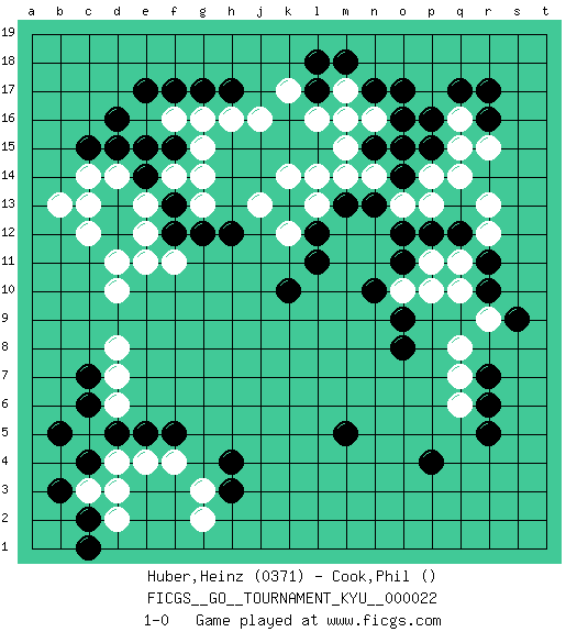 Last move : 1-0 2007 May 24 7:22:45 [Event "FICGS__GO__TOURNAMENT_KYU__000022"] [Site "FICGS"] [Date "2007.02.14"] [Round "1"] [Black "Huber,Heinz"] [White "Cook,Phil"] [Result "1-0"] [Rating 1 "0371"] 1.r5 r15 2.d16 d4 3.p4 d14 4.c15 c14 5.f17 h16 6.h17 j16 7.r17 q16 8.r16 q14 9.q17 q6 10.r6 q7 11.r7 q8 12.c6 d6 13.c4 c5 14.b5 c3 15.d5 e4 16.e5 f4 17.h4 g3 18.h3 d7 19.c7 d8 20.f5 g2 21.c2 d2 22.b3 d3 23.c1 d10 24.k10 q10 25.p16 q15 26.o16 l16 27.m16 f16 28.e15 g15 29.f15 g16 30.g17 f14 31.e14 e13 32.f13 g14 33.d13 e12 34.d12 e11 35.d15 b13 36.e17 c12 37.g12 d11 38.m5 c13 39.q12 r12 40.r11 r13 41.r10 r9 42.s9 q11 43.p12 m15 44.l17 k17 45.l18 n16 46.n17 m17 47.m18 m16 48.o14 o15 49.p15 p14 50.n15 n14 51.o15 o13 52.o17 p11 53.n13 m14 54.o12 p13 55.m13 l13 56.l12 g13 57.f12 f11 58.h12 k12 59.k13 l14 60.l11 j13 61.o11 o10 62.n10 k14 63.o9 p10 64.o8 1-0 Here are the names of the openings (joseki) played in the four corners : Corner d16 : d16 d14 Hoshi (Hwajeom, Seongjeom, Xingwei`) 4-4 Point. The star or hoshi (4-4) point, emphasizing influence at the potential expense of territory. Ikken Takagakari (Hankan Nop'dakeolch'im, Yi Gaojia, 1-Space High Approach). Black typically responds at 6-4 or 3-10. Black 4-10 is played when Black finds play on the right side advantageous. Black 4-8 or 3-8 may be played when Black has support at top. Corner q16 : r15 r17 Mokuhazushi (Waemok, Wai`mu`) 5-3 Point. The mokuhazushi (5-3) point was popular in the Edo period in Japan (1600 - 1867). It emphasizes influence; territorially, it is inferior to the 3-4 point. San-san. Black goes for profit at the expense of influence. A ladder helps Black when playing 2. Corner d4 : d4 c6 Hoshi (Hwajeom, Seongjeom, Xingwei`) 4-4 Point. The star or hoshi (4-4) point, emphasizing influence at the potential expense of territory. Ikken Kakari (Hankan Keolch'im, Yi Gua`jiao~, 1-Space Low Approach). Black 2 is the standard approach move to the 4-4. Player Black won this Go (weiqi, baduk) game. Follow this game move after move (download)Don't defend - extend ! (Bill Taylor) The beginning is the most important part of the work. (Plato)