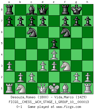 Last move : 0-1 2014 April 29 20:38:56 [Event "FICGS__CHESS__WCH_STAGE_1_GROUP_10__000013"] [Site "FICGS"] [Date "2014.03.03"] [Round "1"] [White "Desouza,Romeo"] [Black "Vida,Marco"] [Result "0-1"] [WhiteElo "1800"] [BlackElo "1429"] 1.e4 e5 2.Nf3 Nc6 3.a3 Bc5 4.d3 Nf6 5.Be3 Bxe3 6.fxe3 O-O 0-1 This chess game has been lost on time (started : 2014.03.03 0:20:7) King's pawn game Kingside Castling by player Black (move 6) Player Black won this chess game. Follow this game move after move (download)The beauty of a move lies not in its' appearance but in the thought behind it. (Siegbert Tarrasch) Ich habe kein Problem mit Frauen, sondern nur mit dem Niveau ihres Schachspiels (Judith Polgar) El juego de Fischer siempre fue nítido, racional y brillante. Uno de los mejores por siempre. (Dave Regis) Les Echecs représentent une sphère d'idées créatrices basée sur la volonté des deux protagonistes. (Smyslov) Always be a first-rate version of yourself, instead of a second-rate version of somebody else. (Judy Garland)