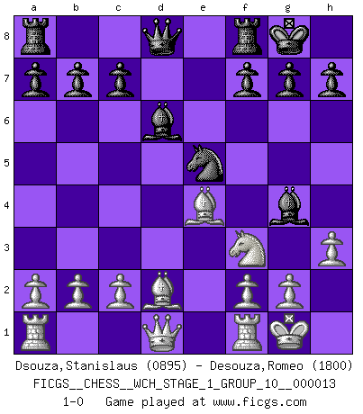Last move : 1-0 2014 April 21 8:13:4 [Event "FICGS__CHESS__WCH_STAGE_1_GROUP_10__000013"] [Site "FICGS"] [Date "2014.03.03"] [Round "1"] [White "Dsouza,Stanislaus"] [Black "Desouza,Romeo"] [Result "1-0"] [WhiteElo "0895"] [BlackElo "1800"] 1.Nf3 Nc6 2.d4 Nf6 3.e3 d5 4.Bd3 e6 5.O-O Bd6 6.Bd2 O-O 7.Nc3 e5 8.dxe5 Nxe5 9.e4 dxe4 10.Nxe4 Nxe4 11.Bxe4 Bg4 12.h3 1-0 This chess game has been lost on time (started : 2014.03.03 0:20:7) Reti Opening Kingside Castling by player White (move 5) Kingside Castling by player Black (move 6) Player White won this chess game. Follow this game move after move (download)The tactician knows what to do when there is something to do; whereas the strategian knows what to do when there is nothing to do. (Gerald Abrahams) Es ist im Leben wie im Schachspiel. Wir entwerfen einen Plan, dieser bleibt jedoch bedingt durch das, was im Schachspiel dem Gegner, im Leben dem Schicksal zu tun belieben wird. (Arthur Schopenhauer) El juego de Damas es para vagabundos. (Paul Morphy) Même un GMI sait rarement calculer sur plus de cinq coups une attaque à sacrifices. (Rudolf Spielmann) Luck has a peculiar habit of favoring those who don't depend on it. (Author unknown)