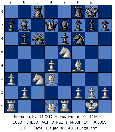 Last move : 1-0 2014 May 13 21:20:13 [Event "FICGS__CHESS__WCH_STAGE_1_GROUP_10__000013"] [Site "FICGS"] [Date "2014.03.03"] [Round "1"] [White "Barbosa,Edinardo"] [Black "Edwardson,Zachariah"] [Result "1-0"] [WhiteElo "1721"] [BlackElo "1500"] 1.d4 Nf6 2.c4 e6 3.Nc3 Bb4 4.e3 O-O 5.Bd3 d5 6.Bd2 c5 7.Nf3 cxd4 8.exd4 dxc4 9.Bxc4 b6 10.O-O Nc6 11.a3 Be7 12.Bf4 Bb7 13.Re1 Rc8 14.Bd3 Qd7 15.Ne5 1-0 This chess game has been lost on time (started : 2014.03.03 0:20:7) Nimzo-Indian : 4.e3 O-O, 5.Bd3 d5 Kingside Castling by player Black (move 4) Kingside Castling by player White (move 10) Player White won this chess game. Follow this game move after move (download)There's never before been a Chess player with such a thorough knowledge of the intricacies of the game and such an absolutely indomitable will to win. I think Bobby is the greatest player that ever lived. (Lisa Lane) Schach ist ein Kampf gegen den Fehler. (Johannes Herrman Zukertort) El Ajedrez por encima de todo... ¡es una pelea!. (Emanuel Lasker) Un footballeur joue avec ses pieds, parfois avec sa tête. Un joueur d'échecs ne joue qu'avec sa tête. Et quand il ne joue plus, il meurt. (Jacob Murray) The intuitive mind is a sacred gift; the rational mind is a faithful servant. We have created a society that honors the servant but has forgotten the gift. (Albert Einstein)