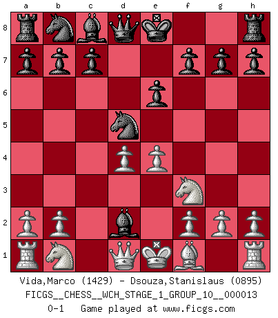 Last move : 0-1 2014 May 8 21:9:49 [Event "FICGS__CHESS__WCH_STAGE_1_GROUP_10__000013"] [Site "FICGS"] [Date "2014.03.03"] [Round "1"] [White "Vida,Marco"] [Black "Dsouza,Stanislaus"] [Result "0-1"] [WhiteElo "1429"] [BlackElo "0895"] 1.d4 Nf6 2.c4 d5 3.cxd5 Nxd5 4.Nf3 e6 5.e4 Bb4+ 6.Bd2 Bxd2+ 0-1 This chess game has been lost on time (started : 2014.03.03 0:20:7) Queen's pawn game Player Black won this chess game. Follow this game move after move (download)When the Chess game is over, the Pawn and the King go back to the same box. (Irish saying) Frage: Wie viele Autos haben Sie schon zerstört? - Antwort: Nur zwei. (Loek van Wely) Ciertamente, de todas la drogas del mundo, el Ajedrez debe ser el mas placentero permamentemente. (Assiac) Les Echecs ne sont pas pour les âmes timides. Ils requièrent un homme entier, qui ne s'arrête pas aveuglément à ce qui a été déjà établi, mais qui tente individuellement de sonder les profondeurs du jeu. (W. Steinitz) Life is like a ten-speed bicycle: most of us have gears we never use. (Charles M. Schulz)
