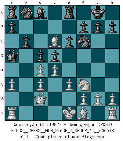 Last move : 0-1 2014 May 31 10:12:42 [Event "FICGS__CHESS__WCH_STAGE_1_GROUP_11__000013"] [Site "FICGS"] [Date "2014.03.03"] [Round "1"] [White "Caceres,Julio"] [Black "James,Angus"] [Result "0-1"] [WhiteElo "1987"] [BlackElo "2083"] 1.d4 Nf6 2.c4 e6 3.Bf4 Bb4+ 4.Nc3 c5 5.e3 d5 6.Nf3 O-O 7.a3 Bxc3+ 8.bxc3 Qa5 9.Qc2 b6 10.Bd6 Re8 0-1 This chess game has been lost on time (started : 2014.03.03 0:21:43) Queen's pawn game Kingside Castling by player Black (move 6) Player Black won this chess game. Follow this game move after move (download)I had a toothache during the first game. In the second game I had a headache. In the third game it was an attack of rheumatism. In the fourth game, I wasn't feeling well. And in the fifth game? Well, must one have to win every game ? (Siegbert Tarrasch) Über Kasparov: Es ist offensichtlich, daß er in einem totalitären Staat aufwuchs und deshalb zu diktatorischen Zügen neigt. (Viktor Kortschnoi) La enorme capacidad mental, en la que sin ella no puede un jugador de Ajedrez existir, es demasiado requerida por el Ajedrez al grado de que nunca podrá liberar su mente de este juego. (Albert Einstein) Horreur, mais aussi harmonie suprême : qu'y avait-il en effet au monde en dehors des échecs ? Le brouillard, l'inconnu, le non-être... (Vladimir Nabokov) It's unlucky to be superstitious. (Dave Enteles)