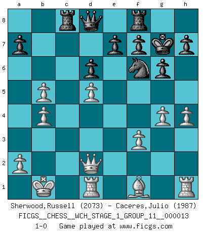 Last move : 1-0 2014 May 30 10:10:3 [Event "FICGS__CHESS__WCH_STAGE_1_GROUP_11__000013"] [Site "FICGS"] [Date "2014.03.03"] [Round "1"] [White "Sherwood,Russell"] [Black "Caceres,Julio"] [Result "1-0"] [WhiteElo "2073"] [BlackElo "1987"] 1.e4 c5 2.Nf3 Nc6 3.d4 cxd4 4.Nxd4 g6 5.Nc3 Bg7 6.Be3 d6 7.Qd2 Nf6 8.f3 O-O 9.O-O-O Nxd4 10.Bxd4 Be6 11.Kb1 Rc8 12.g4 Nd7 13.Bxg7 Kxg7 14.Nd5 Rc5 15.h4 Bxd5 16.exd5 Nf6 17.c4 b5 18.b4 Rc8 19.cxb5 1-0 This chess game has been lost on time (started : 2014.03.03 0:21:43) Sicilian : Accelerated Fianchetto, Modern variation Kingside Castling by player Black (move 8) Queenside Castling by player White (move 9) Player White won this chess game. Follow this game move after move (download)We must make sure that Chess will not be like a dead language, very interesting, but for a very small group. (Sytze Faber) Schach ist mein Leben, meine Leidenschaft, was ich gelernt habe und seit meinem 14. Lebensjahr profimässig praktiziere. Darauf zu verzichten, würde mir sehr schwer fallen. (Viktor Kortschnoi) Cuando le juegas a Fischer, no es una cuestion de si vas a ganar o perder. Es una cuestion de si vas a sobrevivir. (Boris Spassky) Des points faibles ou des trous dans la position de l'adversaire doivent être occupés par des pièces et non pas par des pions. (Siegbert Tarrasch) Vladimir Ras-Putin is still alive... He is also a good actor, I saw him in the Lord of the Rings. (Rodolfo d'Ettorre)