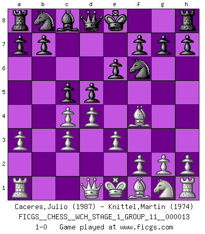 Last move : 1-0 2014 May 18 9:25:42 [Event "FICGS__CHESS__WCH_STAGE_1_GROUP_11__000013"] [Site "FICGS"] [Date "2014.03.03"] [Round "1"] [White "Caceres,Julio"] [Black "Knittel,Martin"] [Result "1-0"] [WhiteElo "1987"] [BlackElo "1974"] 1.d4 d5 2.c4 e6 3.Bf4 Nf6 4.e3 Bb4+ 5.Nc3 c5 6.a3 Bxc3+ 7.bxc3 1-0 This chess game has been lost on time (started : 2014.03.03 0:21:43) Queen's gambit declined Player White won this chess game. Follow this game move after move (download)The battle for the ultimate truth will never be won. And that's why Chess is so fascinating. (Hans Kmoch) Ich spiele 70 Eröffnungssysteme. (Viktor Kortschnoi) El Ajedrez demanda una total concentración. (Bobby Fischer) Même si l'adversaire joue le coup analysé précédemment, recommencez l'analyse en voyant la nouvelle position. Première règle de Blumenfeld The beginning of wisdom is silence. The second step is listening. (Unknown)