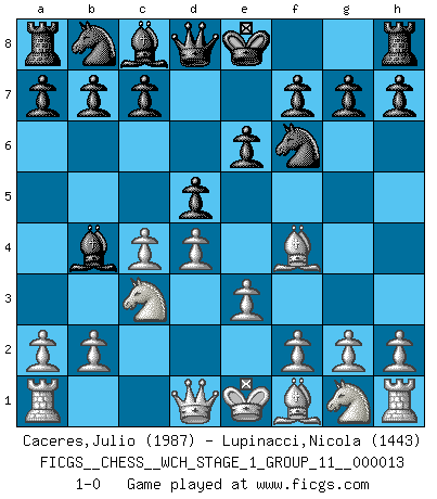 Last move : 1-0 2014 March 16 0:27:40 [Event "FICGS__CHESS__WCH_STAGE_1_GROUP_11__000013"] [Site "FICGS"] [Date "2014.03.03"] [Round "1"] [White "Caceres,Julio"] [Black "Lupinacci,Nicola"] [Result "1-0"] [WhiteElo "1987"] [BlackElo "1443"] 1.d4 d5 2.c4 e6 3.Bf4 Nf6 4.e3 Bb4+ 5.Nc3 1-0 Queen's gambit declined Player White won this chess game. Follow this game move after move (download)The laws of Chess do not permit a free choice: you have to move whether you like it or not. (Emanuel Lasker) Schach sollte überall auf der Welt Schulfach werden. Es fördert die geistige Auseinandersetzung. Es lehrt die Demut in der Niederlage. (Garry Kasparov) No puedes jugar al Ajedrez si eres de corazón noble. (Proverbio Francés) Je ne suis pas le dernier à jouer lâchement des coups douteux pendant le zeïtnot de l'adversaire pour l'achever: en effet les coups qui font le plus peur sont ceux que l'on ne comprend pas. Je me fais souvent peur quand je joue. (Un professeur anonyme) As a goal marker shodan is important. As a destination it is a poor place to stop. (Thomas Tamayo)