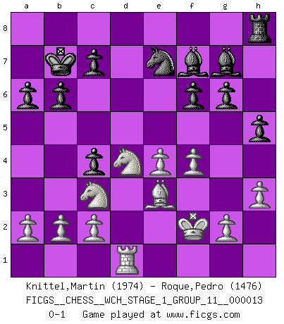 Last move : 0-1 2014 May 23 9:44:33 [Event "FICGS__CHESS__WCH_STAGE_1_GROUP_11__000013"] [Site "FICGS"] [Date "2014.03.03"] [Round "1"] [White "Knittel,Martin"] [Black "Roque,Pedro"] [Result "0-1"] [WhiteElo "1974"] [BlackElo "1476"] 1.e4 e5 2.Nf3 Nc6 3.Bb5 a6 4.Bxc6 dxc6 5.O-O f6 6.d4 exd4 7.Nxd4 c5 8.Nb3 Qxd1 9.Rxd1 Bg4 10.f3 Be6 11.Bf4 c4 12.Nd4 O-O-O 13.Nc3 Bf7 14.Nf5 Rxd1+ 15.Rxd1 Ne7 16.Nd4 b6 17.Kf2 Kb7 18.h3 h5 19.Be3 g6 20.f4 Bg7 0-1 This chess game has been lost on time (started : 2014.03.03 0:21:43) Ruy Lopez : Exchange, Gligoric variation Kingside Castling by player White (move 5) Queenside Castling by player Black (move 12) Player Black won this chess game. Follow this game move after move (download)Fischer Chess play was always razor-sharp, rational and brilliant. One of the best ever. (Dave Regis) Mit Schach schule ich mein Gefühl für Geometrie, was für Tennis und Schach gleichermaßen wichtig ist. (Boris Becker) Nos gusta pensar. (Gary Kasparov) Tous ces prétendus hommes politiques sont les pions, les Cavaliers, les Tours ou les Fous d'une partie d'échecs qui se jouera tant qu'un hasard ne renversera pas l'échiquier. (Honoré de Balzac) The ego is not master in its own house. (Sigmund Freud)