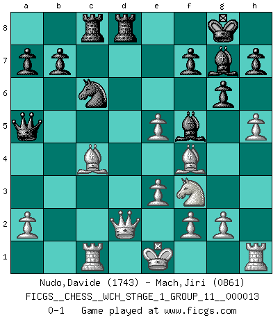 Last move : 0-1 2014 June 29 10:9:53 [Event "FICGS__CHESS__WCH_STAGE_1_GROUP_11__000013"] [Site "FICGS"] [Date "2014.03.03"] [Round "1"] [White "Nudo,Davide"] [Black "Mach,Jiri"] [Result "0-1"] [WhiteElo "1743"] [BlackElo "0861"] 1.Nf3 Nf6 2.d4 g6 3.c4 Bg7 4.Nc3 d5 5.Bg5 Ne4 6.Bf4 Nxc3 7.bxc3 c5 8.e3 O-O 9.cxd5 cxd4 10.cxd4 Qxd5 11.Qd2 Nc6 12.Rc1 Bf5 13.Bc4 Qa5 14.h4 Rac8 15.h5 e5 16.dxe5 Rfd8 0-1 Reti Opening Kingside Castling by player Black (move 8) Player Black won this chess game. Follow this game move after move (download)I don't believe in psychology. I believe in good moves. (Bobby Fischer) Ein bischen Romantik kann weder im Schach noch in der Liebe schaden. Also versuche ich mich ab und zu daran zu erinnern. (Nigel Short) Aquellos que dicen entender al Ajedrez, no entienden nada. (Robert Hubner) Le génie consiste à savoir transgresser les règles au moment opportun. (Teichmann) The arrogant army will lose certainly the battle. (Chinese proverb)