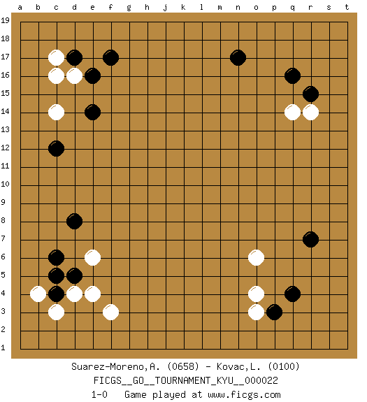 Last move : 1-0 2007 April 29 7:6:22 [Event "FICGS__GO__TOURNAMENT_KYU__000022 "] [Site "FICGS"] [Date "2007.02.14"] [Round "1"] [Black "Suarez-Moreno,Alejandro "] [White "Kovac,Lubos "] [Result "1-0"] [Rating 1 "0658"] [Rating 2 "0100"] 1.q16 d4 2.q4 d16 3.f17 c14 4.d17 c17 5.e16 c16 6.e14 o3 7.p3 o4 8.r7 o6 9.c6 f3 10.c12 e6 11.c4 c3 12.d5 b4 13.c5 e4 14.d8 q14 15.r15 r14 16.n17 1-0 This go game has been lost on time (started : 2007.02.14 12:52:41) Here are the names of the openings (joseki) played in the four corners : Corner d16 : d16 f17Hoshi (Hwajeom, Seongjeom, Xingwei`) 4-4 Point. The star or hoshi (4-4) point, emphasizing influence at the potential expense of territory.Ikken Kakari (Hankan Keolch'im, Yi Gua`jiao~, 1-Space Low Approach). Black 2 is the standard approach move to the 4-4. Corner q4 : q4 o3Hoshi (Hwajeom, Seongjeom, Xingwei`) 4-4 Point. The star or hoshi (4-4) point, emphasizing influence at the potential expense of territory.Ikken Kakari (Hankan Keolch'im, Yi Gua`jiao~, 1-Space Low Approach). White 2 is the standard approach move to the 4-4. Corner d4 : d4 c6Hoshi (Hwajeom, Seongjeom, Xingwei`) 4-4 Point. The star or hoshi (4-4) point, emphasizing influence at the potential expense of territory.Ikken Kakari (Hankan Keolch'im, Yi Gua`jiao~, 1-Space Low Approach). Black 2 is the standard approach move to the 4-4. Corner q16 : q16 q14Hoshi (Hwajeom, Seongjeom, Xingwei`) 4-4 Point. The star or hoshi (4-4) point, emphasizing influence at the potential expense of territory.Ikken Takagakari (Hankan Nop'dakeolch'im, Yi Gaojia, 1-Space High Approach). Black typically responds at 6-4 or 3-10. Black 4-10 is played when Black finds play on the right side advantageous. Black 4-8 or 3-8 may be played when Black has support at top. Player Black won this Go (weiqi, baduk) game.Follow this game move after move (download ) Answer the keima with a kosumi. (Anonymous) The man who strikes first admits that his ideas have given out. (Chinese proverb)