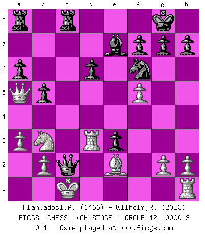 Last move : 0-1 2014 April 16 23:49:25 [Event "FICGS__CHESS__WCH_STAGE_1_GROUP_12__000013"] [Site "FICGS"] [Date "2014.03.03"] [Round "1"] [White "Piantadosi,Angelo"] [Black "Wilhelm,Robert"] [Result "0-1"] [WhiteElo "1466"] [BlackElo "2083"] 1.e4 c5 2.Nf3 d6 3.d4 cxd4 4.Nxd4 Nf6 5.Nc3 a6 6.Bg5 e6 7.f4 b5 8.a3 Nbd7 9.Qd2 Bb7 10.Bd3 Be7 11.O-O-O Qc7 12.f5 e5 13.Nb3 O-O 14.Be2 Bxe4 15.Bxf6 Nxf6 16.Nxe4 Nxe4 17.Qe1 Rfc8 18.Bd3 Nf6 19.Qa5 Qc6 20.Rd2 e4 21.Be2 e3 22.Rd3 Qxc2+ 0-1 Sicilian : Najdorf, Polugayevsky variation Queenside Castling by player White (move 11) Kingside Castling by player Black (move 13) Player Black won this chess game. Follow this game move after move (download)Dazzling combinations are for the many, shifting wood is for the few. (Georg Kieninger) Im Blitz ist es einfacher mit einer Figur weniger anzugreifen, als sich mit einer Mehrfigur zu verteidigen. (Mikhail Nekhemyevich Tal) Aquel que ve no otra dirección en el juego que la de dar Jaque Mate a su oponente, nunca será un buen jugador de Ajedrez. (Euwe) Il n'y a pas eu de défaite parce que je ne crois pas que cet ordinateur ait jamais existé. IBM a triché en refusant d'imprimer les modes de recherche de la machine. C'est évident, pendant le match, des coups décisifs ont été joués par des êtres humains. Aujourd'hui, les meilleurs spécialistes en informatique ne peuvent toujours pas expliquer comment Deep-Blue a pu jouer contre la logique des ordinateurs. IBM a gagné une guerre de communication, mais ils sont incapables de prouver que l'ordinateur a gagné tout seul. (Garry Kasparov) Life is pleasant. Death is peaceful. It's the transition that's troublesome. (Isaac Asimov)