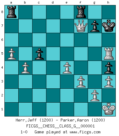 Last move : 1-0 2006 September 17 7:29:31 [Event "FICGS__CHESS__CLASS_G__000001"] [Site "FICGS"] [Date "2006.05.25"] [Round "1"] [White "Herr,Jeff"] [Black "Parker,Aaron"] [Result "1-0"] [WhiteElo "1200"] [BlackElo "1200"] 1.d4 d5 2.c4 Nf6 3.Nf3 Nc6 4.e3 Bg4 5.h3 Bh5 6.cxd5 Qxd5 7.Nc3 Qd7 8.Be2 Bg6 9.O-O e6 10.a3 a6 11.Bd3 Be7 12.e4 Nxd4 13.Nxd4 Qxd4 14.Bb5+ Qd7 15.Bxd7+ Nxd7 16.Bf4 Rc8 17.Qd4 Bf6 18.Qa7 e5 19.Be3 O-O 20.Qxb7 Nb8 21.Ba7 Nd7 22.Qxa6 Bg5 23.Rfd1 Nf6 24.f3 Ra8 25.Qb7 Rfc8 26.Rd3 Nh5 27.Rad1 Nf4 28.Rd7 Ne6 29.Nd5 Nd8 30.Qa6 Ne6 31.b4 c6 32.Nb6 Be3+ 33.Kh1 Bxb6 34.Qxb6 Nd4 35.a4 h6 36.Qb7 Kh7 37.Bxd4 exd4 38.R1xd4 h5 39.a5 h4 40.Rxf7 Bxf7 41.Qxf7 c5 42.Rd5 Rf8 43.Rh5+ 1-0 QGD : Marshall defense Kingside Castling by player White (move 9) Kingside Castling by player Black (move 19) Player White won this chess game. Follow this game move after move (download)Botvinnik tried to take the mystery out of Chess, always relating it to situations in ordinary life. He used to call Chess a typical inexact problem similar to those which people are always having to solve in everyday life. (Garry Kasparov) Die Neutralität betrachte ich als eine schwere Krankheit. (Viktor Kortschnoi) Un juego de Ajedrez es un dialogo, una conversación entre un jugador y su oponente. Cada movimiento del oponente puede contener amenazas o tropiezos, pero un jugador no se puede defender de las amenazas o tomar ventaja de los tropiezos si es que no se pregunta a sí mismo: ¿Que es lo que mi oponente va a hacer después de cada movida?. (Bruce A. Moon) Avant la finale, les dieux ont créé le milieu de partie. (Tarrasch) Logic : The art of thinking and reasoning in strict accordance with the limitations and incapacities of the human misunderstanding. (Ambrose Bierce)