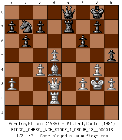 Last move : 1/2-1/2 2014 May 30 1:46:47 [Event "FICGS__CHESS__WCH_STAGE_1_GROUP_12__000013"] [Site "FICGS"] [Date "2014.03.03"] [Round "1"] [White "Pereira,Nilson"] [Black "Altieri,Carlo"] [Result "1/2-1/2"] [WhiteElo "1985"] [BlackElo "1981"] 1.e4 e5 2.Nf3 Nf6 3.Nxe5 d6 4.Nf3 Nxe4 5.d4 d5 6.Bd3 Nc6 7.O-O Be7 8.c4 Nb4 9.Be2 O-O 10.Nc3 Bf5 11.a3 Nxc3 12.bxc3 Nc6 13.Re1 Re8 14.cxd5 Qxd5 15.Bf4 Rac8 16.Bd3 Qd7 17.Rb1 b6 18.d5 Bxd3 19.Qxd3 Bf6 20.c4 Ne7 21.Ne5 Bxe5 22.Bxe5 f6 23.Bf4 Nf5 24.h3 Nd6 25.Qc2 Nb7 26.Bg3 Rcd8 27.Rbd1 Rc8 28.Kh1 Rcd8 29.Kh2 Nc5 30.f3 Ra8 31.Kg1 Rad8 32.Kh1 Rb8 33.Ra1 Rbd8 34.Kh2 Nb7 35.Rad1 Nc5 36.Qd2 Rc8 37.Bf4 Nb7 38.Qc3 Nc5 39.Bg3 Nb7 40.Qc2 Rcd8 41.Bf4 Nc5 42.g4 Qf7 43.Bg3 Rd7 44.Kg2 Rde7 45.Rxe7 Rxe7 46.Rd2 Qe8 47.Bf2 h5 48.Kg3 Nb7 49.Qd3 Re5 50.Bd4 Re7 51.Bf2 Re5 52.Bd4 Re7 1/2-1/2 Petrov : Classical attack Kingside Castling by player White (move 7) Kingside Castling by player Black (move 9) This chess game ended in a draw. Follow this game move after move (download)There is no remorse like the remorse of Chess. (H. G. Wells) Das Schachspiel ist ein See, in welchem eine Mücke baden und ein Elefant ertrinken kann. (Emanuel Lasker) Solo los afeminados hacen el Enroque. (Rob Sillars) Pour moi, les échecs ne sont pas un jeu mais un art. (Alexandre Alekhine) Tomorrow's what you make of it. (Horatio Caine, C.S.I. Miami)