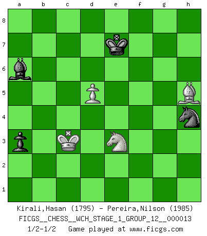 Last move : 1/2-1/2 2014 May 9 15:57:14 [Event "FICGS__CHESS__WCH_STAGE_1_GROUP_12__000013"] [Site "FICGS"] [Date "2014.03.03"] [Round "1"] [White "Kirali,Hasan"] [Black "Pereira,Nilson"] [Result "1/2-1/2"] [WhiteElo "1795"] [BlackElo "1985"] 1.d4 Nf6 2.c4 e6 3.Nf3 d5 4.Nc3 c6 5.e3 Nbd7 6.Qc2 Bd6 7.Bd3 O-O 8.O-O dxc4 9.Bxc4 a6 10.Rd1 b5 11.Be2 Qc7 12.e4 e5 13.g3 Re8 14.a3 h6 15.b4 exd4 16.Nxd4 Bb7 17.Be3 Bf8 18.Nd5 Nxd5 19.exd5 c5 20.bxc5 Qxc5 21.Qxc5 Bxc5 22.Bf1 Ne5 23.Nf5 Bf8 24.Bb6 Nf3+ 25.Kg2 Ng5 26.f3 Rac8 27.Ne3 Bc5 28.Bxc5 Rxc5 29.Rd3 f6 30.h4 Nf7 31.a4 Nd6 32.axb5 axb5 33.Kf2 Kf8 34.Ra7 g6 35.Rd2 Re7 36.Bd3 f5 37.Rc2 Rxc2+ 38.Bxc2 h5 39.Bd3 Rf7 40.Ra5 f4 41.gxf4 Rxf4 42.Bxg6 Ra4 43.Rxa4 bxa4 44.Bc2 a3 45.Bb3 Ba6 46.Ke1 Nb5 47.Kd2 Nd4 48.Kc3 Nxf3 49.Bd1 Nxh4 50.Bxh5 Ke7 1/2-1/2 Queen's pawn game Kingside Castling by player Black (move 7) Kingside Castling by player White (move 8) 10 pieces endgame at move 48 : White KBNPP , Black KBNPP WHITE : King + 1 Bishop 1 Knight 2 Pawns BLACK : King + 1 Bishop 1 Knight 2 Pawns 9 pieces endgame at move 49 : White KBNP , Black KBNPP WHITE : King + 1 Bishop 1 Knight 1 Pawn BLACK : King + 1 Bishop 1 Knight 2 Pawns 8 pieces endgame at move 50 : White KBNP , Black KBNP WHITE : King + 1 Bishop 1 Knight 1 Pawn BLACK : King + 1 Bishop 1 Knight 1 Pawn This chess game ended in a draw. Follow this game move after move (download)During a Chess competition a Chessmaster should be a combination of a beast of prey and a monk. (Alexander Alekhine) Wenn man heute mit 14 Jahren noch kein GM ist, kann man es vergessen. (Viswanathan Anand) Los asuntos humanos son como una partida de Ajedrez: solo aquellos que no lo toman seriamente, pueden ser llamados buenos jugadores. (Hung Tzu Ch'eng) Ce qui caractérise les parties de combat, c'est que si le défenseur a constamment de difficiles problèmes à résoudre, l'attaquant doit chercher sans relâche de nouvelles possibilités d'attaque. (Koblentz) True nature is revealed in times of difficulty. (Chinese proverb)