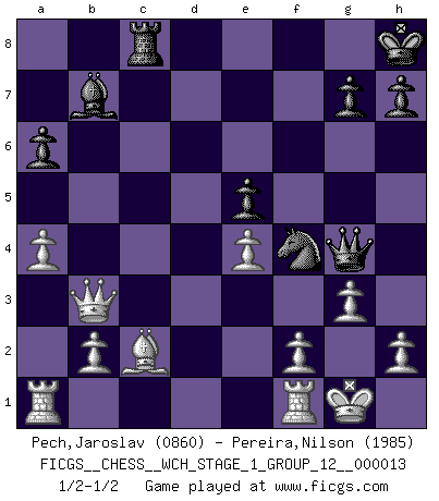 Last move : 1/2-1/2 2014 June 12 17:46:58 [Event "FICGS__CHESS__WCH_STAGE_1_GROUP_12__000013"] [Site "FICGS"] [Date "2014.03.03"] [Round "1"] [White "Pech,Jaroslav"] [Black "Pereira,Nilson"] [Result "1/2-1/2"] [WhiteElo "0860"] [BlackElo "1985"] 1.d4 Nf6 2.c4 e6 3.Nf3 d5 4.Nc3 c6 5.e3 Nbd7 6.Bd3 dxc4 7.Bxc4 b5 8.Bd3 Bb7 9.O-O a6 10.e4 c5 11.d5 Qc7 12.dxe6 fxe6 13.Bc2 c4 14.Nd4 Nc5 15.Be3 e5 16.Nf3 Be7 17.Ng5 O-O 18.Bxc5 Bxc5 19.Ne6 Qb6 20.Nxf8 Rxf8 21.Qe2 Qe6 22.a4 b4 23.Nd5 Nxd5 24.Qxc4 Nf4 25.Qxc5 Rc8 26.Qxb4 Qg4 27.Qb3+ Kh8 28.g3 Ne2+ 29.Kg2 Nf4+ 30.Kg1 Ne2+ 31.Kg2 Nf4+ 32.Kg1 1/2-1/2 Queen's pawn game Kingside Castling by player White (move 9) Kingside Castling by player Black (move 17) This chess game ended in a draw. Follow this game move after move (download)Who is your opponent tonight, tonight I am playing against the Black pieces. (Akiba Rubinstein) Ich habe Putins Aufstieg an die Macht beobachtet und seine Politik, die demokratischen Institutionen meines Landes zu zerstören. (Garry Kasparov) El Ajedrez es un juego de pelea el cual es puramente intelectual e incluye la suerte. (Richard Reti) Le jeu d'échecs fait naître et fortifie en nous plusieurs qualités précieuses dans le cours de l'existence, telles que la prévoyance, la circonspection, la prudence, et la persévérance. (Benjamin Franklin - 1783, la morale des échecs) Strategy without tactics is the slowest route to victory. Tactics without strategy is the noise before defeat. (Sun Tzu)