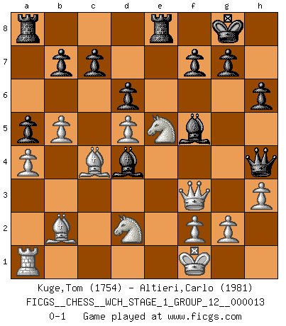 Last move : 0-1 2014 March 10 19:22:43 [Event "FICGS__CHESS__WCH_STAGE_1_GROUP_12__000013"] [Site "FICGS"] [Date "2014.03.03"] [Round "1"] [White "Kuge,Tom"] [Black "Altieri,Carlo"] [Result "0-1"] [WhiteElo "1754"] [BlackElo "1981"] 1.e4 e5 2.Nf3 Nc6 3.Bc4 Bc5 4.O-O d6 5.c3 Nf6 6.Qe2 O-O 7.h3 h6 8.b4 Bb6 9.a4 a5 10.b5 Ne7 11.d4 exd4 12.cxd4 Nxe4 13.d5 Ng3 14.Qc2 Bf5 15.Qb3 Nxf1 16.Kxf1 Ng6 17.Bb2 Re8 18.Nbd2 Ne5 19.Nxe5 Qh4 20.Qf3 Bd4 0-1 Giuoco Piano Kingside Castling by player White (move 4) Kingside Castling by player Black (move 6) Player Black won this chess game. Follow this game move after move (download)By the beauty of his games, the clarity of his play, and the brilliance of his ideas, Fischer made himself an artist of the same stature as Brahms, Rembrandt, and Shakespeare. (David Levy) Rubinstein ist ein Turmendspiel, welches die Götter vor tausenden von Jahren begannen. (Savielly Grigorievitsch Tartakower) El estómago es una parte esencial del maestro de Ajedrez. (Bent Larsen) On a dit que l'homme se distingue de l'animal par le fait qu'il achète plus de livres qu'il ne peut en lire. Je voudrais suggérer qu'inclure à la liste des livres quelques livres d'échecs rendrait la distinction manifeste. (Edward Lasker) It's only after you lost everything, Tyler says, that you're free to do anything. (Chuck Palahniuk, Fight Club)