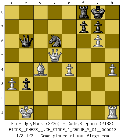 Last move : 1/2-1/2 2014 April 28 11:52:18 [Event "FICGS__CHESS__WCH_STAGE_1_GROUP_M_01__000013"] [Site "FICGS"] [Date "2014.03.03"] [Round "1"] [White "Eldridge,Mark"] [Black "Cade,Stephen"] [Result "1/2-1/2"] [WhiteElo "2220"] [BlackElo "2183"] 1.e4 c5 2.Nf3 d6 3.d4 cxd4 4.Nxd4 Nf6 5.Nc3 a6 6.f3 e5 7.Nb3 Be6 8.Be3 Be7 9.Qd2 O-O 10.O-O-O Nbd7 11.g4 b5 12.g5 b4 13.Ne2 Ne8 14.f4 a5 15.f5 a4 16.Nbd4 exd4 17.Nxd4 b3 18.Kb1 bxc2+ 19.Nxc2 Bb3 20.axb3 axb3 21.Na3 Ne5 22.h4 Ra4 23.Bd4 Nf3 24.Qc3 Nxd4 25.Rxd4 Rxd4 26.Qxd4 d5 27.Qxd5 Qb6 28.Bc4 Bxa3 29.bxa3 Nd6 30.g6 hxg6 31.fxg6 1/2-1/2 Sicilian : Najdorf Kingside Castling by player Black (move 9) Queenside Castling by player White (move 10) This chess game ended in a draw. Follow this game move after move (download)The essence of Chess is thinking about what Chess is. (David Bronstein) Schach ist ein Kampf gegen den Fehler. (Johannes Herrman Zukertort) Es muy difícil jugar en contra de la teoría de Einstein. - en su primera derrota en contra de Fischer (Mikhail Tal) Les réformistes prétendent que les progrès de la théorie conduiront à la disparition des échecs, et qu'il faut, pour leur rendre vie, en remanier les règles. En réalité, qu'exprime cette affirmation? Le mépris de l'intuition, de l'imagination et de tous les autres éléments qui font des échecs un art. (Alexander Alekhine) The worth of a book is to be measured by what you can carry away from it. (James Bryce)