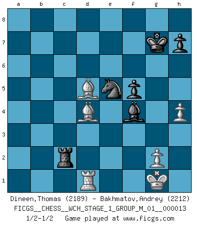 Last move : 1/2-1/2 2014 May 8 16:6:40 [Event "FICGS__CHESS__WCH_STAGE_1_GROUP_M_01__000013"] [Site "FICGS"] [Date "2014.03.03"] [Round "1"] [White "Dineen,Thomas"] [Black "Bakhmatov,Andrey"] [Result "1/2-1/2"] [WhiteElo "2189"] [BlackElo "2212"] 1.d4 Nf6 2.c4 g6 3.Nc3 Bg7 4.e4 d6 5.Nf3 O-O 6.Be2 e5 7.Be3 Ng4 8.Bg5 f6 9.Bh4 Nd7 10.O-O Nh6 11.Qd2 Nf7 12.Rad1 c6 13.h3 Re8 14.Qc2 Qc7 15.Bg3 a6 16.b4 b5 17.a4 a5 18.cxb5 cxb5 19.Rb1 axb4 20.Rxb4 Rxa4 21.Rb2 Ra8 22.Qb3 Ba6 23.Nxb5 Bxb5 24.Bxb5 Rec8 25.Rfb1 Ra7 26.Qe6 Nf8 27.Qd5 Ra5 28.Rb4 Bh6 29.Qb3 Kg7 30.Bc4 Ra7 31.Qd3 Qe7 32.Rb6 Nd7 33.Rb7 Rc7 34.Rxa7 Rxa7 35.Bd5 Rc7 36.Qe2 Ng5 37.Nxg5 Bxg5 38.h4 Bh6 39.Qb2 f5 40.dxe5 dxe5 41.f4 Rc8 42.Rd1 Qc5+ 43.Bf2 Qc2 44.Qxc2 Rxc2 45.fxe5 Nxe5 46.Bd4 Bf4 47.exf5 gxf5 1/2-1/2 King's Indian : Gligoric-Taimanov system Kingside Castling by player Black (move 5) Kingside Castling by player White (move 10) This chess game ended in a draw. Follow this game move after move (download)When you absolutely don't know what to do anymore, it is time to panic. (John van der Wiel) Schach ist das schnellste Spiel der Welt, weil man in jeder Sekunde Tausende von Gedanken ordnen muß. (Albert Einstein) El jugador táctico sabe que hacer cuando hay algo que hacer; mientras que el estratega sabe que hacer cuando no hay nada que hacer. (Gerald Abrahams) Il n'y a plus de joueurs du niveau de Jacob Murray dont la seule quête est le beau jeu, le plaisir de voir les pièces construire quelque chose. Sur 10 idées à la minute, 9 seront sans intérêt, la dernière s'avèrera géniale. (Christian Bauer) There are more things in heaven and earth than practically anywhere else. (Unknown)