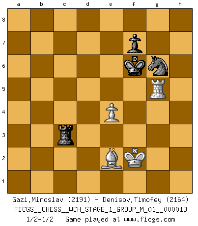 Last move : 1/2-1/2 2014 July 14 8:17:1 [Event "FICGS__CHESS__WCH_STAGE_1_GROUP_M_01__000013"] [Site "FICGS"] [Date "2014.03.03"] [Round "1"] [White "Gazi,Miroslav"] [Black "Denisov,Timofey"] [Result "1/2-1/2"] [WhiteElo "2191"] [BlackElo "2164"] 1.d4 d5 2.c4 e6 3.Nf3 Nf6 4.Nc3 dxc4 5.e4 Bb4 6.Bg5 c5 7.Bxc4 cxd4 8.Nxd4 Bxc3+ 9.bxc3 Qa5 10.Bb5+ Nbd7 11.Bxf6 Qxc3+ 12.Kf1 gxf6 13.h4 a6 14.Rh3 Qb4 15.Be2 Ne5 16.Rb3 Qd6 17.a4 O-O 18.Nf3 Qxd1+ 19.Rxd1 Nc6 20.Nd4 Na5 21.Rg3+ Kh8 22.Nb3 Nc6 23.f4 Rd8 24.Rxd8+ Nxd8 25.Rd3 Nc6 26.Nc5 Kg7 27.Kf2 e5 28.Rd6 Nd4 29.a5 Nc6 30.Bxa6 Nb4 31.Bxb7 Rxa5 32.Bxc8 Rxc5 33.Bg4 Rc4 34.fxe5 fxe5 35.Bf5 Rc3 36.g3 h5 37.Rb6 Nd3+ 38.Ke2 Ra3 39.Rb5 Nc1+ 40.Kf2 Nd3+ 41.Kg2 Rc3 42.g4 Nf4+ 43.Kf2 hxg4 44.Bxg4 Ng6 45.Be2 Nxh4 46.Rxe5 Ng6 47.Rg5 Kf6 1/2-1/2 Queen's gambit declined Kingside Castling by player Black (move 17) 10 pieces endgame at move 44 : White KRBPP , Black KRNPP WHITE : King + 1 Rook 1 Bishop 2 Pawns BLACK : King + 1 Rook 1 Knight 2 Pawns 9 pieces endgame at move 45 : White KRBP , Black KRNPP WHITE : King + 1 Rook 1 Bishop 1 Pawn BLACK : King + 1 Rook 1 Knight 2 Pawns 8 pieces endgame at move 46 : White KRBP , Black KRNP WHITE : King + 1 Rook 1 Bishop 1 Pawn BLACK : King + 1 Rook 1 Knight 1 Pawn This chess game ended in a draw. Follow this game move after move (download)Chess is ruthless: you've got to be prepared to kill people. (Nigel Short) Wer der Ansicht ist, daß alle Schachspieler verrückt sind, wird durch Studium des Lebens von Emil Josef Diemer nicht auf andere Gedanken kommen. (Hans Ree) Buenas posiciones no logran ganar juegos, buenas movidas sí. (Gerald Abrahams) Même si vous avez un bon coup à faire, regardez toujours s'il n'y en a pas un qui lui soit préférable. (Pedro Damiano) Question: Is 'This statement is paradoxical' a paradoxical statement ? Or is it a meta-paradox ? (Normajean Yates)
