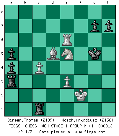 Last move : 1/2-1/2 2014 June 27 21:9:55 [Event "FICGS__CHESS__WCH_STAGE_1_GROUP_M_01__000013"] [Site "FICGS"] [Date "2014.03.03"] [Round "1"] [White "Dineen,Thomas"] [Black "Wosch,Arkadiusz"] [Result "1/2-1/2"] [WhiteElo "2189"] [BlackElo "2156"] 1.d4 Nf6 2.c4 e6 3.Nc3 Bb4 4.e3 O-O 5.Bd3 d5 6.Nf3 c5 7.O-O Nc6 8.a3 Bxc3 9.bxc3 dxc4 10.Bxc4 Qc7 11.Bb2 e5 12.h3 Bf5 13.Qe2 Rad8 14.Bb5 e4 15.Nd2 Na5 16.c4 cxd4 17.Bxd4 Nd7 18.Rad1 a6 19.Ba4 Nc5 20.Bc2 Bg6 21.Rb1 Rfe8 22.Rfd1 f5 23.Bc3 b6 24.Bxa5 bxa5 25.Nb3 Nd3 26.Nd4 f4 27.Ba4 f3 28.gxf3 exf3 29.Qxf3 Rf8 30.Ne6 Rxf3 31.Nxc7 Be4 32.Ne6 Rxh3 33.f3 Bxf3 34.Rxd3 Rh1+ 35.Kf2 Rxd3 36.Rb8+ Kf7 37.Ng5+ Kf6 38.Nxf3 Rc1 39.Rf8+ Ke7 40.Re8+ Kf6 41.Ne5 Rxa3 42.Bc6 a4 43.Bd5 a5 44.Re6+ Kg5 1/2-1/2 Nimzo-Indian : 4.e3 O-O, 5.Bd3 d5 Kingside Castling by player Black (move 4) Kingside Castling by player White (move 7) This chess game ended in a draw. Follow this game move after move (download)Bobby is the most misunderstood, misquoted celebrity walking the face of this earth. (Yasser Seirawan) Fischer: 'Remis!?' Uhlmann: 'Aber es muss doch dreimal Zugwiederholung sein!' Fischer: 'Sie nehmen das Remis an, wie ich es sage, sonst spiele ich weiter und werde Sie dann schlagen!' (Robert James Fischer) Bobby es el jugador de Ajedrez mas fino que este país jamás haya producido. Su memoria para las movidas, su brillantez en soñar combinaciones y su feróz determinación por la victoria son algo extraño. (John Collins) Les réformistes prétendent que les progrès de la théorie conduiront à la disparition des échecs, et qu'il faut, pour leur rendre vie, en remanier les règles. En réalité, qu'exprime cette affirmation? Le mépris de l'intuition, de l'imagination et de tous les autres éléments qui font des échecs un art. (Alexander Alekhine) This is where the fun begins. (Anakin Skywalker in Star Wars ep.3)