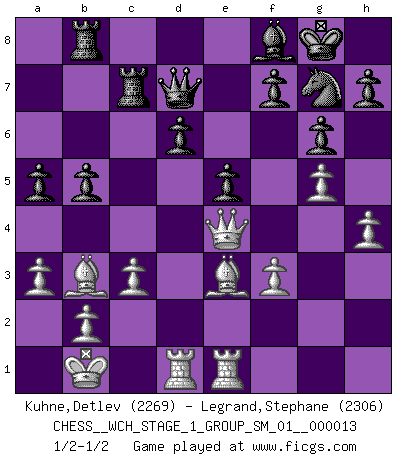 Last move : 1/2-1/2 2014 June 5 23:6:11 [Event "FICGS__CHESS__WCH_STAGE_1_GROUP_SM_01__000013"] [Site "FICGS"] [Date "2014.03.03"] [Round "1"] [White "Kuhne,Detlev"] [Black "Legrand,Stephane"] [Result "1/2-1/2"] [WhiteElo "2269"] [BlackElo "2306"] 1.e4 c5 2.Nf3 d6 3.d4 cxd4 4.Nxd4 Nf6 5.Nc3 a6 6.Be3 e5 7.Nb3 Be7 8.f3 Be6 9.Qd2 O-O 10.O-O-O Nbd7 11.g4 b5 12.Rg1 Nb6 13.Na5 Rc8 14.g5 Nh5 15.Kb1 g6 16.a3 Qc7 17.Nd5 Bxd5 18.exd5 Nxd5 19.Qxd5 Qxa5 20.Bd3 Qc7 21.Be4 Rb8 22.Qd3 Rfc8 23.c3 a5 24.Bd5 Qd7 25.Bb3 Bf8 26.Rge1 Rc7 27.Qe4 Ng7 28.h4 Qc8 29.Rc1 Qf5 30.Rcd1 Qc8 31.Re2 Nh5 32.Rg2 Qe8 33.Rg4 Qd7 34.R4g1 Ng7 35.Rge1 Nh5 36.Rg1 Ng7 37.Rge1 1/2-1/2 Sicilian : Najdorf, Byrne (English) attack Kingside Castling by player Black (move 9) Queenside Castling by player White (move 10) This chess game ended in a draw. Follow this game move after move (download)Chess is in its essence a game, in its form an art, and in its execution a science. (Baron Tassilo) Die westlichen Werte sind eine Sprache, welche die Putin-Administration nicht versteht. (Garry Kasparov) En el Ajedrez, tal como en la vida, las bendiciones de hoy pueden ser el veneno del mañana. (Assaic) 'L'échange des dames est un coup dur pour les deux adversaires...' Un journaliste lors d'une partie du match Spassky-Fischer It's only after you lost everything, Tyler says, that you're free to do anything. (Chuck Palahniuk, Fight Club)