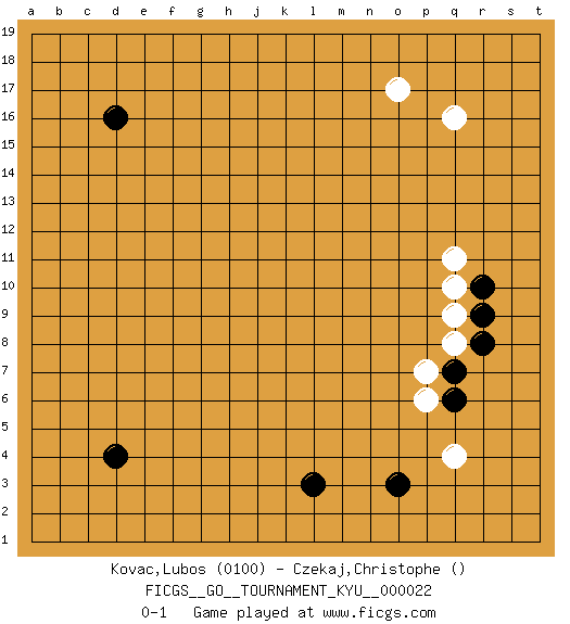 Last move : 0-1 2007 April 26 0:45:31 [Event "FICGS__GO__TOURNAMENT_KYU__000022"] [Site "FICGS"] [Date "2007.02.14"] [Round "1"] [Black "Kovac,Lubos"] [White "Czekaj,Christophe"] [Result "0-1"] [Rating 1 "0100"] 1.d4 q4 2.d16 q16 3.o3 q10 4.q6 p6 5.l3 o17 6.r8 q8 7.q7 p7 8.r9 q9 9.r10 q11 0-1 This go game has been lost on time (started : 2007.02.14 12:52:41) Here are the names of the openings (joseki) played in the four corners : Corner q4 : q4 o3 Hoshi (Hwajeom, Seongjeom, Xingwei`) 4-4 Point. The star or hoshi (4-4) point, emphasizing influence at the potential expense of territory. Ikken Kakari (Hankan Keolch'im, Yi Gua`jiao~, 1-Space Low Approach). Black 2 is the standard approach move to the 4-4. Player White won this Go (weiqi, baduk) game. Follow this game move after move (download)There are possible things, impossible things, and things that happen. Sometimes things happen that were impossible. (Pierre Audouard) The meaning of life is that it is to be lived, and it is not to be traded and conceptualized and squeezed into a pattern of systems. (Bruce Lee)