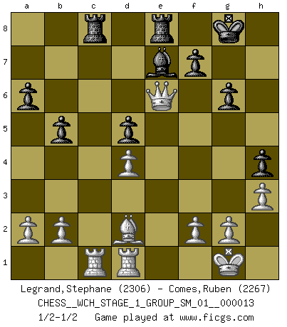 Last move : 1/2-1/2 2014 June 15 18:10:4 [Event "FICGS__CHESS__WCH_STAGE_1_GROUP_SM_01__000013"] [Site "FICGS"] [Date "2014.03.03"] [Round "1"] [White "Legrand,Stephane"] [Black "Comes,Ruben"] [Result "1/2-1/2"] [WhiteElo "2306"] [BlackElo "2267"] 1.d4 d5 2.c4 c6 3.Nf3 Nf6 4.Nc3 e6 5.e3 Nbd7 6.Qc2 Bd6 7.Be2 O-O 8.O-O dxc4 9.Bxc4 b5 10.Be2 a6 11.Rd1 Qc7 12.Ne4 Nxe4 13.Qxe4 Bb7 14.Bd3 g6 15.Qh4 c5 16.Ng5 h5 17.Ne4 Bxe4 18.Bxe4 Rac8 19.Bd2 Rfe8 20.Rac1 Be7 21.Qh3 Qb6 22.Qg3 h4 23.Qf4 cxd4 24.exd4 Nf6 25.Bf3 Nd5 26.Bxd5 exd5 27.h3 Qf6 28.Qg4 Qe6 29.Qxe6 1/2-1/2 QGD Slav : 4.Nc3 Kingside Castling by player Black (move 7) Kingside Castling by player White (move 8) This chess game ended in a draw. Follow this game move after move (download)The Chess pieces are the block alphabet which shapes thoughts; and these thoughts, although making a visual design on the chessboard, express their beauty abstractly, like a poem. (Marcel Duchamp) Ich bin es gewohnt, das die Jugend mir überhaupt keinen Respekt entgegenbringt. (Alexander Morozewich) Si tu oponente te ofrece un empate, trata de averiguar porque piensa él que esta en una posición peor. (Nigel Short) On entre au jeu d'Echecs comme on entre en Religion. Pour le joueur d'Echecs, la partie d'Echecs c'est l'office, la messe, le défilé du 1er Mai, le dépôt de gerbe au Monument aux Morts. C'est un drame sacré. (Michel Roos) Memory... is the diary that we all carry with us. (Oscar Wilde, The Importance of Being Earnest)