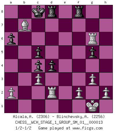 Last move : 1/2-1/2 2014 May 5 13:44:33 [Event "FICGS__CHESS__WCH_STAGE_1_GROUP_SM_01__000013"] [Site "FICGS"] [Date "2014.03.03"] [Round "1"] [White "Alcala,Alvin"] [Black "Blinchevsky,Alexander"] [Result "1/2-1/2"] [WhiteElo "2306"] [BlackElo "2256"] 1.d4 d5 2.c4 c6 3.Nc3 Nf6 4.Nf3 e6 5.Bg5 dxc4 6.e4 b5 7.e5 h6 8.Bh4 g5 9.Nxg5 hxg5 10.Bxg5 Nbd7 11.g3 Bb7 12.exf6 c5 13.d5 Nxf6 14.Bg2 Bh6 15.Bxf6 Qxf6 16.O-O O-O-O 17.Nxb5 a6 18.Nc3 exd5 19.Qc2 Qg6 20.Qxg6 fxg6 21.Rae1 Bg7 22.Re6 g5 23.Rd1 Bd4 24.Rg6 Rhf8 25.Rd2 Bxc3 26.bxc3 d4 27.Bxb7+ 1/2-1/2 QGD Slav defense Kingside Castling by player White (move 16) Queenside Castling by player Black (move 16) This chess game ended in a draw. Follow this game move after move (download)You cannot play at Chess if you are kind-hearted. (French Proverb) Ich liebe den Moment, wenn ich das Ego meines Gegenüber breche. (Robert James Fischer) Si el ingenio solamente fuese necesario para lucirse, las mujeres serían las mejores jugadoras de Ajedrez del mundo. (Albin) Vous m'avez demandé de vous exposer quel est le fondement de la prière. Je ne fais que préparer les pièces du jeu sur la table... Nous sera-t-il permis d'en adopter les règles et si nous les appliquons scrupuleusement nous ne tarderons pas à faire mat le Roi divin ! Il ne pourra échapper à nos mains. (Sainte Thérèse d'Avila, Chemin de perfection) Statistics can be made to prove anything - even the truth. (Author unknown)