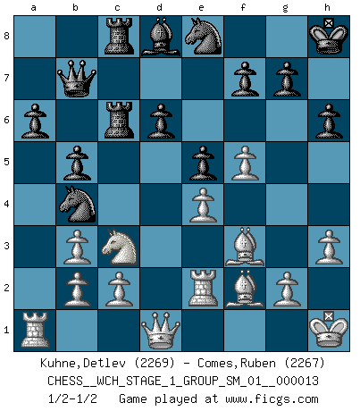 Last move : 1/2-1/2 2014 May 14 22:42:4 [Event "FICGS__CHESS__WCH_STAGE_1_GROUP_SM_01__000013"] [Site "FICGS"] [Date "2014.03.03"] [Round "1"] [White "Kuhne,Detlev"] [Black "Comes,Ruben"] [Result "1/2-1/2"] [WhiteElo "2269"] [BlackElo "2267"] 1.e4 c5 2.Nf3 d6 3.d4 cxd4 4.Nxd4 Nf6 5.Nc3 a6 6.Be3 e5 7.Nb3 Be6 8.h3 Be7 9.f4 Nc6 10.f5 Bxb3 11.axb3 Nb4 12.Bf2 Rc8 13.Bc4 b5 14.Bd3 O-O 15.O-O Qd7 16.Be2 h6 17.Bf3 Rc6 18.Re1 Rfc8 19.Re2 Bd8 20.Kh1 Qb7 21.Bh4 Be7 22.Kg1 Bd8 23.Kh1 Be7 24.Kg1 Bd8 25.Kh2 Qd7 26.Rd2 Ne8 27.Bf2 Qb7 28.Re2 Kh8 29.Kh1 1/2-1/2 Sicilian : Najdorf, Byrne (English) attack Kingside Castling by player Black (move 14) Kingside Castling by player White (move 15) This chess game ended in a draw. Follow this game move after move (download)Chess is the art of analysis. (Mikhail Botvinnik) Frage des Reporters: -Worin besteht das Ziel von Gambiteröffnungen? Antwort: -Auf Kosten der Partie einen Ruf als Angriffspieler zu erwerben.- (Siegbert Tarrasch) Prefiero perder una partida realmente buena, que ganar una mala. (David Levy) La guerre est enfant de la passion, la passion est enfant du narcissisme et le narcissisme est l'enfant. (...) Une autre partie ? (Thibault de Vassal) It's unlucky to be superstitious. (Dave Enteles)