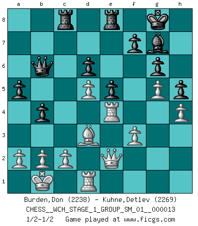 Last move : 1/2-1/2 2014 June 15 0:26:2 [Event "FICGS__CHESS__WCH_STAGE_1_GROUP_SM_01__000013"] [Site "FICGS"] [Date "2014.03.03"] [Round "1"] [White "Burden,Don"] [Black "Kuhne,Detlev"] [Result "1/2-1/2"] [WhiteElo "2238"] [BlackElo "2269"] 1.e4 c5 2.Nf3 d6 3.d4 cxd4 4.Nxd4 Nf6 5.Nc3 a6 6.Be3 e5 7.Nb3 Be6 8.f3 h5 9.Qd2 Nbd7 10.O-O-O Be7 11.Kb1 b5 12.Nd5 Bxd5 13.exd5 Nb6 14.Bxb6 Qxb6 15.Na5 Rc8 16.Bd3 b4 17.Nc4 Qb7 18.Qe2 O-O 19.Ne3 Qa7 20.g4 g6 21.h4 Rfe8 22.Rdg1 Kg7 23.Qd2 Rh8 24.g5 Nd7 25.Rd1 Rhe8 26.Nc4 Qc5 27.Rhe1 Bf8 28.Bf1 Nb6 29.Re4 a5 30.Nxb6 Qxb6 31.Bd3 Kg8 32.Qe2 Bg7 1/2-1/2 Sicilian : Najdorf, Byrne (English) attack Queenside Castling by player White (move 10) Kingside Castling by player Black (move 18) This chess game ended in a draw. Follow this game move after move (download)We don't really know how the game was invented, though there are suspicions. As soon as we discover the culprits, we'll let you know. (Bruce Pandolfini) Die jungen Leute sollen verstehen, dass sie noch etwas von mir lernen können und müssen. (Viktor Kortschnoi) Yo adoro todas la posiciones. Denme una partida posicional difícil, y la jugaré. Pero posiciones totalmente ganadas, no las tolero. (Hein Donner) Il vaut toujours mieux jouer un plan faux de façon logique que de n'avoir pas de plan du tout. (Victor Kortchnoï) Humor is by far the most significant activity of the human brain. (Edward De Bono)