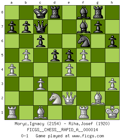 Last move : 0-1 2007 April 6 16:8:58 [Event "FICGS__CHESS__RAPID_A__000014"] [Site "FICGS"] [Date "2007.02.14"] [Round "1"] [White "Moryc,Ignacy"] [Black "Riha,Josef"] [Result "0-1"] [WhiteElo "2154"] [BlackElo "1920"] 1.Nf3 d5 2.g3 Nf6 3.Bg2 c6 4.O-O Bg4 5.d4 Nbd7 6.Nbd2 e6 7.c3 h6 8.Ne5 Nxe5 9.dxe5 Nd7 10.h3 Bh5 11.g4 Bg6 12.f4 Qb6+ 13.Kh1 O-O-O 14.b4 f6 15.e4 fxe5 16.f5 Bf7 17.Qe2 exf5 18.gxf5 Qc7 19.a4 Nf6 20.b5 Rg8 0-1 This chess game has been lost on time (started : 2007.02.14 17:7:33) Reti : King's Indian attack, Yugoslav variation Kingside Castling by player White (move 4) Queenside Castling by player Black (move 13) Player Black won this chess game. Follow this game move after move (download)Nonsense was the last thing Fischer was interested in, as far as Chess was concerned. (Elie Agur) Sie führen leise Selbstgespräche, schlürfen lautstark ihre Getränke, schmatzen hörbar beim Essen, blasen ihrem Gegenüber Rauch in die Augen, niesen ihm ins Gesicht, starren ihn unverwandt an, bis er sich unter ihren Blicken windet, rutschen ständig auf ihrem Stuhl hin und her, rülpsen und bohren in der Nase. (Anonymous) Dios mío, Bobby Fischer juega tan simple. (Alexei Suetin) Un journaliste : 'Vous préférez avoir une dame de plus sur l'échiquier ou au lit ?' Boris Spassky : 'Ca dépend de la position.' Panic is a sudden desertion of us, an a going over to the enemy of our imagination. (Christian Nevell Bovee)