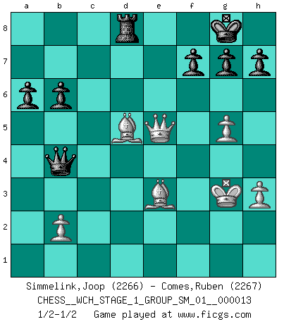 Last move : 1/2-1/2 2014 April 10 15:48:25 [Event "FICGS__CHESS__WCH_STAGE_1_GROUP_SM_01__000013"] [Site "FICGS"] [Date "2014.03.03"] [Round "1"] [White "Simmelink,Joop"] [Black "Comes,Ruben"] [Result "1/2-1/2"] [WhiteElo "2266"] [BlackElo "2267"] 1.e4 c5 2.Nf3 d6 3.d4 cxd4 4.Nxd4 Nf6 5.Nc3 a6 6.Be3 e5 7.Nb3 Be6 8.h3 Be7 9.f4 Nc6 10.f5 Bxb3 11.axb3 Nb4 12.g3 Qc8 13.Rh2 O-O 14.Rd2 d5 15.Nxd5 Nbxd5 16.exd5 Ne4 17.d6 Bxd6 18.Rxd6 Nxd6 19.Qxd6 Qxc2 20.Rd1 Rac8 21.Rd2 Qxf5 22.Bg2 Rc2 23.g4 Rxd2 24.Kxd2 Qb1 25.Qxe5 Rd8+ 26.Ke2 Qc2+ 27.Kf3 Qxb3 28.Kg3 b6 29.g5 Qb4 30.Bd5 1/2-1/2 Sicilian : Najdorf, Byrne (English) attack Kingside Castling by player Black (move 13) This chess game ended in a draw. Follow this game move after move (download)There are tough players and nice guys, and I'm a tough player. (Bobby Fischer) Jeder leidlich begabte Spieler, er braucht keineswegs hervorragend veranlagt zu sein, kann es zum Meister bringen. Aber das ist ja auch gar nicht nötig! Der richtige Standpunkt ist es, zu seinem Vergnügen zu spielen, und man glaube ja nicht, dass der Genuss proportional dem Können sei. (Siegbert Tarrasch) ¿Que sería del Ajedrez sin errores graciosos?. (Kurt Richter) On entre au jeu d'Echecs comme on entre en Religion. Pour le joueur d'Echecs, la partie d'Echecs c'est l'office, la messe, le défilé du 1er Mai, le dépôt de gerbe au Monument aux Morts. C'est un drame sacré. (Michel Roos) Memory is a complicated thing, a relative to truth, but not its twin. (Barbara Kingsolver, Animal Dreams)