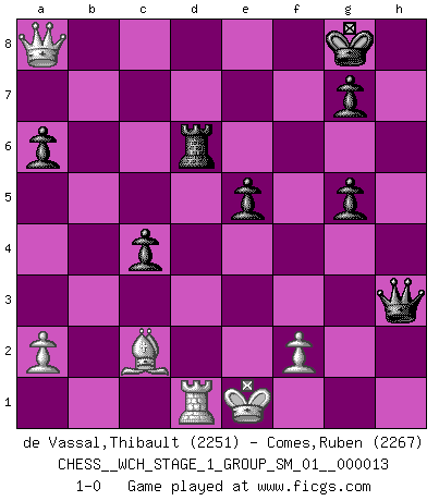 Last move : 1-0 2014 August 10 0:45:31 [Event "FICGS__CHESS__WCH_STAGE_1_GROUP_SM_01__000013"] [Site "FICGS"] [Date "2014.03.03"] [Round "1"] [White "de Vassal,Thibault"] [Black "Comes,Ruben"] [Result "1-0"] [WhiteElo "2251"] [BlackElo "2267"] 1.d4 d5 2.c4 c6 3.Nc3 Nf6 4.Nf3 e6 5.e3 Nbd7 6.Bd3 dxc4 7.Bxc4 b5 8.Bd3 Bb7 9.O-O a6 10.e4 c5 11.d5 Qc7 12.dxe6 fxe6 13.Bc2 c4 14.Nd4 Nc5 15.Be3 e5 16.Nf3 Be7 17.Ng5 Rd8 18.Qe2 h6 19.Bxc5 hxg5 20.Bxe7 Qxe7 21.Rad1 Rd4 22.Qe3 Ng4 23.Qg3 Nxh2 24.Rfe1 Kf7 25.b3 Rh6 26.bxc4 bxc4 27.Nd5 Bxd5 28.exd5 Rg4 29.Qc3 Qd6 30.Re4 Qf6 31.Re3 Rgh4 32.d6 Qf4 33.Qb4 Ng4 34.Qb7+ Kg8 35.Qd5+ Kf8 36.Qa8+ Kf7 37.Qa7+ Kg8 38.Rh3 Rxh3 39.gxh3 Rf6 40.hxg4 Qxg4+ 41.Kf1 Qh3+ 42.Ke1 Rxd6 43.Qa8+ 1-0 QGD Slav defense Kingside Castling by player White (move 9) Player White won this chess game. Follow this game move after move (download)You sit at the board and suddenly your heart leaps. Your hand trembles to pick up the piece and move it. But what Chess teaches you is that you must sit there calmly and think about whether it's really a good idea and whether there are other better ideas. (Stanley Kubrick) Moralische Siege zählen nicht. (Savielly Grigorievitsch Tartakower) ¿Cual es el objetivo de jugar una apertura de gambito?... Para adquirir una reputación de ser un jugador apuesto a costo de perder el juego. (Siegbert Tarrasch) Les Echecs ne sont pas pour les âmes timides. Ils requièrent un homme entier, qui ne s'arrête pas aveuglément à ce qui a été déjà établi, mais qui tente individuellement de sonder les profondeurs du jeu. (W. Steinitz) You cannot beat a roulette table unless you steal money from it. (Albert Einstein)