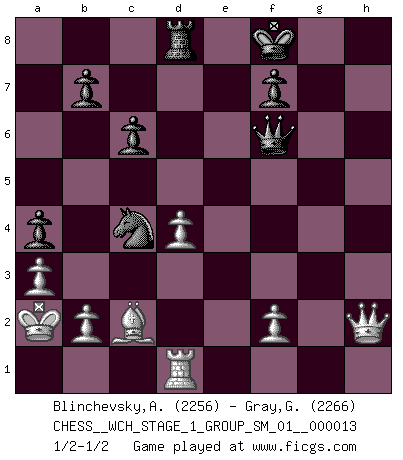 Last move : 1/2-1/2 2014 May 20 16:29:55 [Event "FICGS__CHESS__WCH_STAGE_1_GROUP_SM_01__000013"] [Site "FICGS"] [Date "2014.03.03"] [Round "1"] [White "Blinchevsky,Alexander"] [Black "Gray,Garvin"] [Result "1/2-1/2"] [WhiteElo "2256"] [BlackElo "2266"] 1.d4 d5 2.c4 e6 3.Nc3 Be7 4.cxd5 exd5 5.Bf4 c6 6.e3 Bf5 7.g4 Be6 8.h3 Nd7 9.Nf3 g5 10.Bh2 h5 11.gxh5 Rxh5 12.Rg1 a5 13.a3 Kf8 14.Qe2 Rh6 15.e4 Nb6 16.Qe3 Bxh3 17.Be2 Be6 18.Nxg5 Bxg5 19.Rxg5 Rxh2 20.Rxg8+ Kxg8 21.Qg3+ Kf8 22.Qxh2 dxe4 23.O-O-O Qg5+ 24.Kb1 Rd8 25.Nxe4 Bf5 26.Bd3 Bxe4 27.Bxe4 Nc4 28.Ka2 Qf6 29.Bc2 a4 1/2-1/2 QGD : Charousek (Petrosian) variation Queenside Castling by player White (move 23) This chess game ended in a draw. Follow this game move after move (download)When you don't know what to do, wait for your opponent to get an idea - it's sure to be wrong. (Tarrasch) Smyslow ist ein Beweis dafür, dass ich noch zehn Jahre spielen kann! [der 75 jährige über den 85 jährigen] (Viktor Kortschnoi) Si el ingenio solamente fuese necesario para lucirse, las mujeres serían las mejores jugadoras de Ajedrez del mundo. (Albin) La victoire dans une partie d'Echecs appartient la plupart du temps à celui qui voit un peu plus loin que l'adversaire. (Lasker) You lose, general Kenobi. (General Grievous in Star Wars ep.3)