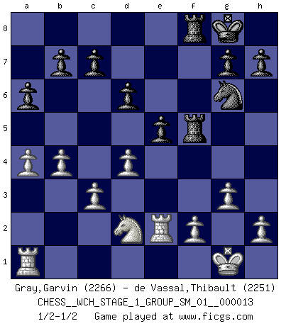 Last move : 1/2-1/2 2014 April 18 23:36:54 [Event "FICGS__CHESS__WCH_STAGE_1_GROUP_SM_01__000013"] [Site "FICGS"] [Date "2014.03.03"] [Round "1"] [White "Gray,Garvin"] [Black "de Vassal,Thibault"] [Result "1/2-1/2"] [WhiteElo "2266"] [BlackElo "2251"] 1.e4 e5 2.Nf3 Nc6 3.Bc4 Nf6 4.d3 Bc5 5.O-O d6 6.c3 O-O 7.b4 Bb6 8.a4 a6 9.Nbd2 Ne7 10.Bb3 Ng6 11.Nc4 Ba7 12.Be3 Be6 13.Bxa7 Rxa7 14.Ne3 Qd7 15.g3 R7a8 16.Re1 Bxb3 17.Qxb3 Qh3 18.Qd1 Ng4 19.Nxg4 Qxg4 20.Nd2 Qh3 21.Qf3 f5 22.exf5 Qxf5 23.Qxf5 Rxf5 24.d4 Raf8 25.Re2 1/2-1/2 Two knights defense (Modern Bishop's Opening) Kingside Castling by player White (move 5) Kingside Castling by player Black (move 6) This chess game ended in a draw. Follow this game move after move (download)Fischer sacrificed virtually everything most of us weakies (to use his term) value, respect, and cherish, for the sake of an artful, often beautiful board game, for the ambivalent privilege of being its greatest master. (Paul Kollar) Mit sehr nachdenklichem Gesicht schreitet Bobby durch den Turniersaal. Was ist passiert?, fragt Lombardy. Ich stehe schlecht, antwortet Fischer. Lombardy: Dann biete doch einfach Remis an. Fischer: So schlecht stehe ich nun auch wieder nicht! (Robert James Fischer) Con el tiempo, empecé a progresar en partidas decisivas. Tal vez porque me di cuenta de una simple verdad: no solo estaba yo nervioso sino también mi oponente. (Mikhail Tal) La vie est comme un jeu d'échecs : nous esquissons un plan, mais celui-ci est tributaire de ce que daignent faire l'adversaire aux échecs et le destin dans la vie. (Arthur Schopenhauer) First of all, we have to go back to the classical time control. (Anatoly Karpov)