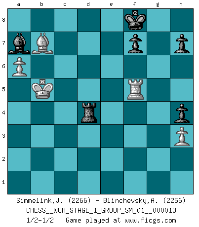 Last move : 1/2-1/2 2014 April 8 17:21:45 [Event "FICGS__CHESS__WCH_STAGE_1_GROUP_SM_01__000013"] [Site "FICGS"] [Date "2014.03.03"] [Round "1"] [White "Simmelink,Joop"] [Black "Blinchevsky,Alexander"] [Result "1/2-1/2"] [WhiteElo "2266"] [BlackElo "2256"] 1.e4 e5 2.Nf3 Nf6 3.d4 Nxe4 4.Bd3 d5 5.Nxe5 Nd7 6.Nxd7 Bxd7 7.O-O Bd6 8.c4 c6 9.cxd5 cxd5 10.Nc3 Nxc3 11.bxc3 O-O 12.Qh5 g6 13.Qxd5 Qc7 14.g3 Be6 15.Qf3 Qxc3 16.Rb1 Qxd4 17.Be4 Qc4 18.Bxb7 Rad8 19.Bg5 Rb8 20.Be3 Qc3 21.a4 Qa5 22.Qf6 Be5 23.Qh4 Bc3 24.Rb5 Qd8 25.Bxa7 Qxh4 26.gxh4 Bc4 27.Bxb8 Bxf1 28.Kxf1 Rxb8 29.Ke2 Kf8 30.h5 gxh5 31.Kd3 Be1 32.Kc4 h4 33.h3 Bxf2 34.a5 Ba7 35.a6 Rd8 36.Rf5 Rd4+ 37.Kb5 1/2-1/2 Joop Simmelink Thanks for the game! Petrov : Modern attack, Symmetrical variation Kingside Castling by player White (move 7) Kingside Castling by player Black (move 11) This chess game ended in a draw. Follow this game move after move (download)A win by an unsound combination, however showy, fills me with artistic horror. (Wilhelm Steinitz) Modernes Schach sorgt sich zuviel um Dinge wie Bauernstruktur usw. Vergessen Sie das, Schachmatt beendet das Spiel! (Nigel Short) Hay jugadores fuertes y personas amables y yo soy un jugador fuerte. (Bobby Fischer) Vous n'êtes pas toujours obligé de jouer le meilleur coup. Un coup doit être actif, entreprenant, correct et beau ! (David Bronstein) For to win one hundred victories in one hundred battles is not the acme of skill. To subdue the enemy without fighting is the acme of skill. (Sun Tzu)