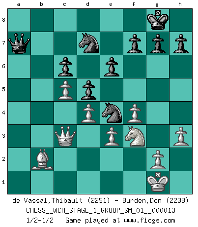Last move : 1/2-1/2 2014 May 23 22:49:19 [Event "FICGS__CHESS__WCH_STAGE_1_GROUP_SM_01__000013"] [Site "FICGS"] [Date "2014.03.03"] [Round "1"] [White "de Vassal,Thibault"] [Black "Burden,Don"] [Result "1/2-1/2"] [WhiteElo "2251"] [BlackElo "2238"] 1.d4 Nf6 2.c4 e6 3.Nc3 Bb4 4.f3 d5 5.a3 Be7 6.e3 O-O 7.c5 a5 8.Rb1 c6 9.b4 b6 10.f4 Ba6 11.Bxa6 Rxa6 12.Qd3 axb4 13.axb4 Ra7 14.Nf3 Nbd7 15.O-O Qc7 16.h3 Rfa8 17.Bb2 Bd8 18.Rfc1 bxc5 19.bxc5 Qc8 20.Ra1 Ba5 21.Ra4 Qc7 22.Rca1 Bxc3 23.Rxa7 Rxa7 24.Rxa7 Qxa7 25.Qxc3 Ne4 1/2-1/2 Nimzo-Indian : Kmoch variation Kingside Castling by player Black (move 6) Kingside Castling by player White (move 15) This chess game ended in a draw. Follow this game move after move (download)With or without the title, Bobby Fischer was unquestionably the greatest player of his time. (Burt Hochberg) Ich kenne Menschen, die allen Willen der Welt besitzen und doch nicht Schach spielen können. (Robert James Fischer) El jugador de combinación piensa hacia adelante; comienza de la posición dada y trabaja las movidas contundentes en su mente. (Emanuel Lasker) Karpov est une pièce de musée. (Garry Kasparov) You can't play chess if you're groggy from pills. (Anatoly Karpov)