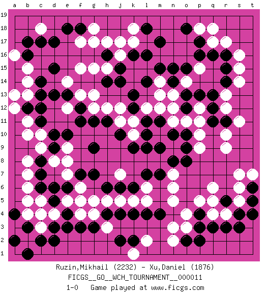 Last move : 1-0 2014 April 17 14:18:56 [Event "FICGS__GO__WCH_TOURNAMENT__000011"] [Site "FICGS"] [Date "2014.03.03"] [Round "1"] [Black "Ruzin,Mikhail"] [White "Xu,Daniel"] [Result "1-0"] [Rating 1 "2232"] [Rating 2 "1876"] 1.p16 r4 2.d15 c5 3.p4 q6 4.m4 r9 5.d17 k17 6.m17 g17 7.h16 h17 8.k16 j16 9.j15 j17 10.l16 f15 11.d3 f4 12.d5 d4 13.e4 c4 14.e3 e5 15.d6 c3 16.f3 g4 17.e6 f5 18.g3 h3 19.h4 f6 20.f7 h5 21.j4 j5 22.k4 e7 23.c6 e8 24.g7 j7 25.h6 g5 26.c2 b2 27.d2 b6 28.c7 b7 29.c8 c9 30.j6 k5 31.k6 l5 32.l4 l6 33.l7 n6 34.m7 n5 35.r3 q4 36.d9 d8 37.g9 e9 38.g11 n9 39.q3 p5 40.r16 r13 41.p13 s16 42.f18 f17 43.e18 h15 44.h14 g15 45.j14 r17 46.r15 q17 47.p17 s15 48.r14 s14 49.q13 r12 50.l9 o3 51.o2 n3 52.s4 s5 53.r5 q5 54.s3 l2 55.k2 n2 56.p2 b15 57.c14 b14 58.c13 c18 59.b17 b13 60.c12 b11 61.b12 a12 62.d10 c10 63.c11 b10 64.e10 b8 65.c17 g18 66.n10 m10 67.m9 n11 68.o10 o11 69.m11 p10 70.o9 p9 71.o8 m12 72.l11 n13 73.o12 p12 74.q12 p11 75.o13 n12 76.q11 r10 77.r11 s11 78.l18 k18 79.t5 s6 80.t6 t7 81.t4 s7 82.n14 m14 83.m15 o14 84.n15 p15 85.o15 f13 86.b1 l12 87.k12 k11 88.l10 j12 89.k13 g12 90.h11 h12 91.f12 e12 92.f11 g13 93.q16 p18 94.o18 q18 95.b3 b4 96.a2 j11 97.j10 k1 98.j2 n7 99.a4 b5 100.e13 e14 101.d13 k10 102.k9 a16 103.b16 a13 104.l14 m13 105.p3 o4 106.n8 1-0 Here are the names of the openings (joseki) played in the four corners : Corner q4 : r4 p4 Komoku (Somok, Xiao~mu`) 3-4 Point. The komoku (3-4) point is the traditional corner enclosure move.. Ikken Takagakari (Hankan Nop'dakeolch'im, Yi Gaogua`jiao~, 1-Space High Approach). The 5-4 approach move has become more popular in modern times, as modern Go emphasizes speed and influence. Corner d4 : c5 d3 Mokuhazushi (Waemok, Wai`mu`) 5-3 Point. The mokuhazushi (5-3) point was popular in the Edo period in Japan (1600 - 1867). It emphasizes influence; territorially, it is inferior to the 3-4 point. Komoku Kakari. Black 2 is the standard approach because of its solidity and stability. Player Black won this Go (weiqi, baduk) game. Follow this game move after move (download)White is always trying to kill a bigger group than black is trying to save. (Anonymous) Remember : Your focus determines your reality. (Qui-Gon Jinn in Star Wars ep.1)