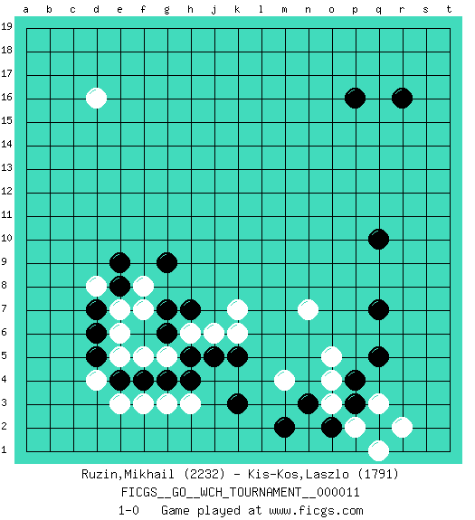 Last move : 1-0 2014 April 9 8:41:0 [Event "FICGS__GO__WCH_TOURNAMENT__000011"] [Site "FICGS"] [Date "2014.03.03"] [Round "1"] [Black "Ruzin,Mikhail"] [White "Kis-Kos,Laszlo"] [Result "1-0"] [Rating 1 "2232"] [Rating 2 "1791"] 1.p16 d4 2.q5 d16 3.r16 q3 4.p3 p2 5.p4 o3 6.q2 r2 7.o2 q1 8.n3 o4 9.m2 o5 10.q7 m4 11.k3 n7 12.q10 h3 13.k5 k7 14.h5 f3 15.h7 j6 16.j5 h6 17.g6 g5 18.g7 k6 19.g4 f5 20.f4 e5 21.h4 g3 22.e4 e3 23.d5 e6 24.d6 e7 25.d7 d8 26.e8 f8 27.e9 f7 28.g9 1-0 Here are the names of the openings (joseki) played in the four corners : Corner q4 : q5 q3 Takamoku (Gomok, Gaomu`) 5-4 Point. The takamoku (high) point (5-4). With its emphasis on influence, the 5-4 point complements the 4-4 (hoshi) point in creating an influence-oriented fuseki. Komoku. Black responds with 3-3, 3-5, 4-6, 4-7, 3-6, 3-7. Player Black won this Go (weiqi, baduk) game. Follow this game move after move (download)If you have won four corners, resign. (Anonymous) The mind is like a parachute, it only functions when its open. (Unknown)