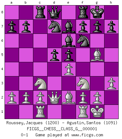 Last move : 0-1 2006 July 2 12:6:3 [Event "FICGS__CHESS__CLASS_G__000001"] [Site "FICGS"] [Date "2006.05.25"] [Round "1"] [White "Roussey,Jacques"] [Black "Agustin,Santos"] [Result "0-1"] [WhiteElo "1200"] [BlackElo "1091"] 1.e4 c5 2.Nf3 d6 3.d4 cxd4 4.Nxd4 e5 5.Nf3 Nf6 6.Nc3 Bg4 7.Be2 Be7 8.O-O O-O 9.h3 Be6 10.Bg5 Nbd7 11.Qd2 Rc8 12.Rac1 d5 0-1 Sicilian Kingside Castling by player White (move 8) Kingside Castling by player Black (move 8) Player Black won this chess game. Follow this game move after move (download)I don't believe in psychology. I believe in good moves. (Bobby Fischer) Es liegt in der Natur, vernüftig zu denken und unlogisch zu handeln. (Anatole France) El Ajedrez es parte de una cultura y si una cultura esta en decadencia, entonces también el Ajedrez declinará. (Mikhail Botvinnik) Seul un grand joueur sait à quel point il joue faiblement. (Xavier Tartacover) All battles are fought by scared men who'd rather be someplace else. (John Wayne in the movie In harm's way)
