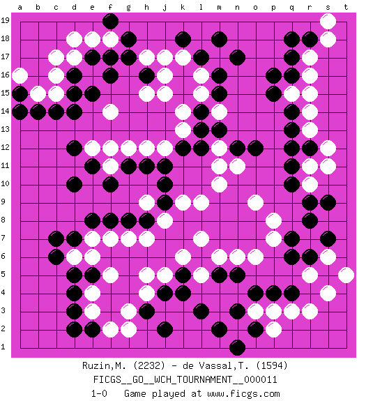 Last move : 1-0 2014 September 13 1:9:58 [Event "FICGS__GO__WCH_TOURNAMENT__000011"] [Site "FICGS"] [Date "2014.03.03"] [Round "1"] [Black "Ruzin,Mikhail"] [White "de Vassal,Thibault"] [Result "1-0"] [Rating 1 "2232"] [Rating 2 "1594"] 1.p16 r17 2.q17 r16 3.l17 d17 4.q14 q15 5.p15 r14 6.q13 r13 7.q12 j17 8.c14 c15 9.d15 c16 10.d14 j15 11.d16 c17 12.e17 e16 13.f16 e18 14.f17 l16 15.m16 l15 16.m15 m17 17.n17 k17 18.m18 m14 19.l14 k14 20.l13 k13 21.l12 r3 22.q4 q3 23.p4 p3 24.o4 r5 25.q6 r7 26.r6 s6 27.s5 s4 28.s7 t5 29.r8 r11 30.r12 s12 31.q11 r10 32.q10 l9 33.k12 l7 34.d4 h9 35.c6 j12 36.j11 h12 37.h11 g12 38.g11 f12 39.d10 l5 40.l3 h4 41.k4 j5 42.k5 k6 43.j9 j8 44.h8 k9 45.j10 h7 46.g8 g7 47.f8 f14 48.e15 m10 49.e11 f7 50.e8 e7 51.d7 e4 52.d3 e3 53.o2 o3 54.n3 m11 55.n12 f18 56.h16 j16 57.g18 h17 58.g17 h15 59.f19 d18 60.b14 b15 61.a15 a16 62.a14 m12 63.m13 n2 64.m2 p2 65.n1 n11 66.e2 f2 67.d2 g2 68.e5 f5 69.j2 o9 70.r9 o6 71.n5 n6 72.m5 m6 73.o12 e12 74.d12 p7 75.q7 p8 76.r18 s18 77.q18 s19 78.q16 r15 79.h3 g3 80.j4 h5 81.s9 s11 82.k18 f11 83.f10 e6 84.d5 d6 85.c7 1-0 Here are the names of the openings (joseki) played in the four corners : Corner q16 : p16 r17 Takamoku (Gomok, Gaomu`) 5-4 Point. The takamoku (high) point (5-4). With its emphasis on influence, the 5-4 point complements the 4-4 (hoshi) point in creating an influence-oriented fuseki. San-san. White plays the 3-3 when Black has a stone at top such as marked. Corner q4 : r3 q4 San-San (Sam-Sam, San-San) 3-3 Point. The San-San (3-3) point, emphasizing territory at the expense of influence. Kata-tsuki (shoulder hit). The shoulder-hit is the traditional answer to the 3-3. The direction of White 3 depends on the positions on the side. Crawling once may be the premise for a follow-up move of sliding with a knight's move in the opposite direction. If White plays 3 at 3-4 (to the right), the follow-on knight's move is then played at the top (e.g. 3-4, 4-5, 5-2). White's knight's move reduces territory potential on the side it is played. Corner d4 : d4 h9 Hoshi (Hwajeom, Seongjeom, Xingwei`) 4-4 Point. The star or hoshi (4-4) point, emphasizing influence at the potential expense of territory. Player Black won this Go (weiqi, baduk) game. Follow this game move after move (download)Play slow, win slow; play fast, lose fast. (Anonymous) To err is human, to shift the blame on someone else is tactical. (Mladen Jankovic)