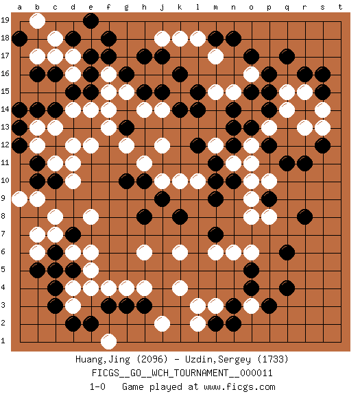Last move : 1-0 2014 September 24 23:25:36 [Event "FICGS__GO__WCH_TOURNAMENT__000011"] [Site "FICGS"] [Date "2014.03.03"] [Round "1"] [Black "Huang,Jing"] [White "Uzdin,Sergey"] [Result "1-0"] [Rating 1 "2096"] [Rating 2 "1733"] 1.q17 d4 2.q4 d16 3.f17 d14 4.k16 k4 5.q11 k10 6.c6 c8 7.f3 d6 8.d7 e6 9.c3 d3 10.c4 c7 11.d5 e5 12.c5 f4 13.d2 e8 14.g3 o3 15.q6 q15 16.r16 r15 17.p16 r13 18.s12 p13 19.n13 s13 20.r11 o12 21.m11 o10 22.m9 o8 23.p9 o9 24.m7 p8 25.r8 o6 26.o5 n6 27.o4 m3 28.p3 m6 29.k8 n15 30.o15 o14 31.n14 m15 32.l14 o16 33.p15 m17 34.o17 k18 35.j17 k15 36.l15 j18 37.h17 k6 38.n18 f16 39.e17 d17 40.g16 f15 41.g13 g15 42.h15 h14 43.j15 j14 44.k14 j12 45.d13 c13 46.c12 d12 47.e13 d11 48.c14 b13 49.d15 e14 50.e15 f14 51.e16 f13 52.c16 g12 53.h8 m12 54.n12 n11 55.n10 o11 56.l12 h6 57.j9 l10 58.m10 j2 59.n3 f1 60.e2 e4 61.m2 l3 62.b14 j10 63.h10 h11 64.g10 l2 65.n2 c17 66.b16 e18 67.f18 b17 68.d18 b19 69.e19 c18 70.a18 b6 71.b5 b7 72.a13 b12 73.b11 c11 74.a12 e12 75.b10 b9 76.c10 d10 77.s15 s14 78.s16 h4 79.h3 a9 80.a14 l18 81.m18 g4 82.p14 q14 83.o13 p10 84.p12 1-0 Here are the names of the openings (joseki) played in the four corners : Corner d16 : d16 f17 Hoshi (Hwajeom, Seongjeom, Xingwei`) 4-4 Point. The star or hoshi (4-4) point, emphasizing influence at the potential expense of territory. Ikken Kakari (Hankan Keolch'im, Yi Gua`jiao~, 1-Space Low Approach). Black 2 is the standard approach move to the 4-4. Corner d4 : d4 c6 Hoshi (Hwajeom, Seongjeom, Xingwei`) 4-4 Point. The star or hoshi (4-4) point, emphasizing influence at the potential expense of territory. Ikken Kakari (Hankan Keolch'im, Yi Gua`jiao~, 1-Space Low Approach). Black 2 is the standard approach move to the 4-4. Corner q4 : q4 o3 Hoshi (Hwajeom, Seongjeom, Xingwei`) 4-4 Point. The star or hoshi (4-4) point, emphasizing influence at the potential expense of territory. Ikken Kakari (Hankan Keolch'im, Yi Gua`jiao~, 1-Space Low Approach). White 2 is the standard approach move to the 4-4. Player Black won this Go (weiqi, baduk) game. Follow this game move after move (download)I really believe that Go is destined to take the place of Chess as the leading intellectual game of the Occident, just as it has reigned supreme in the Orient for some four thousand years. (Edward Lasker, international chess master) Man is reluctant to give credit for intelligence to anyone, except his enemies. (Albert Einstein)