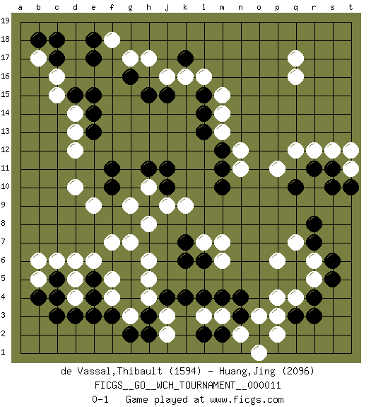 Last move : 0-1 2014 October 4 13:23:11 [Event "FICGS__GO__WCH_TOURNAMENT__000011 "] [Site "FICGS"] [Date "2014.03.03"] [Round "1"] [Black "de Vassal,Thibault "] [White "Huang,Jing "] [Result "0-1"] [Rating 1 "1594"] [Rating 2 "2096"] 1.c3 q16 2.r4 c16 3.k4 d4 4.c4 d5 5.c5 d6 6.d3 c6 7.e4 d10 8.q10 p4 9.q3 p3 10.n3 r5 11.s5 q4 12.r3 r6 13.s6 p6 14.e17 g17 15.e15 d14 16.d15 c15 17.e14 d13 18.e13 d12 19.h15 j16 20.g16 h17 21.j15 l16 22.e5 e6 23.f6 f7 24.g6 g7 25.f11 h6 26.g5 h5 27.g4 h4 28.h3 j3 29.j4 g3 30.h2 f4 31.f3 f5 32.e3 j2 33.g2 l3 34.l4 m3 35.m4 n2 36.o2 o3 37.n4 p2 38.m2 o1 39.l2 r12 40.r7 q7 41.r8 q17 42.l14 m14 43.l13 m13 44.j11 p11 45.r11 q12 46.m12 n12 47.m11 n11 48.c17 b17 49.c18 s12 50.s11 t11 51.t10 t12 52.s10 h10 53.l15 m15 54.b18 k9 55.f10 e9 56.j10 j9 57.h9 g9 58.h11 h8 59.k7 l7 60.l6 m7 61.m10 m6 62.k6 f18 63.e18 b5 64.b4 b6 65.k17 k16 0-1 Here are the names of the openings (joseki) played in the four corners : Corner d4 : c3 d4San-San (Sam-Sam, San-San) 3-3 Point. The San-San (3-3) point, emphasizing territory at the expense of influence.Kata-tsuki (shoulder hit). The shoulder-hit is the traditional answer to the 3-3. The direction of Black 3 depends on the positions on the side. Crawling once may be the premise for a follow-up move of sliding with a knight's move in the opposite direction. If Black plays 3 at 3-4 (to the right), the follow-on knight's move is then played at the top (e.g. 3-4, 4-5, 5-2). Black's knight's move reduces territory potential on the side it is played. Corner q4 : r4 p4Komoku (Somok, Xiao~mu`) 3-4 Point. The komoku (3-4) point is the traditional corner enclosure move..Ikken Takagakari (Hankan Nop'dakeolch'im, Yi Gaogua`jiao~, 1-Space High Approach). The 5-4 approach move has become more popular in modern times, as modern Go emphasizes speed and influence. Corner d16 : c16 e17Komoku (Somok, Xiao~mu`) 3-4 Point. The komoku (3-4) point is the traditional corner enclosure move..Ikken Kakari (Hankan Keolch'im, Yi Gua`jiao~, 1-Space Low Pincer). The small knight move is the basic approach move to the 3-4 point stone. It has been continually used for over four centuries. There are limitless variations, with new moves constantly being discovered. Black 2 opens the door to a treaure store of joseki. Player White won this Go (weiqi, baduk) game.Follow this game move after move (download ) Ikken tobi is never wrong. (Anonymous) There are two kinds of tragedy in this world, one is not getting what you want and the other is getting. (Lord of war)