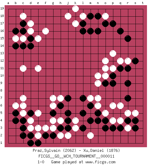 Last move : 1-0 2014 March 31 14:59:47 [Event "FICGS__GO__WCH_TOURNAMENT__000011"] [Site "FICGS"] [Date "2014.03.03"] [Round "1"] [Black "Praz,Sylvain"] [White "Xu,Daniel"] [Result "1-0"] [Rating 1 "2062"] [Rating 2 "1876"] 1.q16 d17 2.q3 d4 3.r9 k3 4.d15 f16 5.c17 d16 6.c16 c15 7.c14 b15 8.b14 e15 9.d14 c18 10.b16 c7 11.o17 r3 12.r4 q4 13.p3 p4 14.o3 r5 15.s4 s5 16.s3 p6 17.o4 o5 18.n5 n6 19.m6 m5 20.n4 n7 21.l5 m7 22.m4 g3 23.c3 d3 24.c4 c5 25.b5 b6 26.d5 c6 27.d2 e2 28.c2 e5 29.b4 r12 30.q11 q12 31.r15 p11 32.p10 o10 33.o9 n10 34.p12 o11 35.r11 p13 36.p9 n9 37.r7 q6 38.l16 o12 39.s12 n17 40.n16 m17 41.m16 o18 42.p17 k17 43.l17 l18 44.k18 j18 45.m18 k19 46.n18 c11 47.l7 e11 48.g5 g6 49.h6 g7 50.h3 h2 51.g2 h4 52.j3 j2 53.j4 k4 54.j5 g4 55.f2 f3 56.e1 e3 57.d1 m2 58.l3 h7 59.j7 1-0 Sylvain Praz thx for the game! Here are the names of the openings (joseki) played in the four corners : Corner d16 : d17 d15 Komoku (Somok, Xiao~mu`) 3-4 Point. The komoku (3-4) point is the traditional corner enclosure move.. Ikken Takagakari (Hankan Nop'dakeolch'im, Yi Gaogua`jiao~, 1-Space High Approach). The 5-4 approach move has become more popular in modern times, as modern Go emphasizes speed and influence. Player Black won this Go (weiqi, baduk) game. Follow this game move after move (download)Don't make a play adjacent to a cutting-point. (Anonymous) In God we trust, all others we virus scan. (Anonymous)