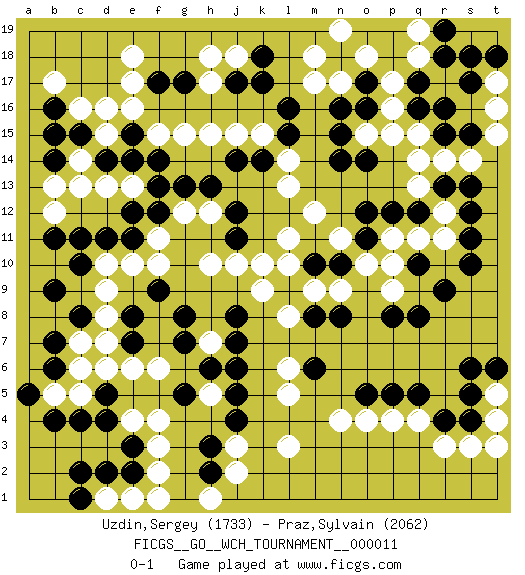 Last move : 0-1 2014 July 28 23:30:56 [Event "FICGS__GO__WCH_TOURNAMENT__000011"] [Site "FICGS"] [Date "2014.03.03"] [Round "1"] [Black "Uzdin,Sergey"] [White "Praz,Sylvain"] [Result "0-1"] [Rating 1 "1733"] [Rating 2 "2062"] 1.q16 d16 2.d4 r3 3.q5 p4 4.p5 o4 5.r4 s3 6.o5 n4 7.k17 r11 8.r9 r14 9.r15 q14 10.o16 p11 11.m6 p9 12.q8 l5 13.j4 l3 14.s10 c6 15.c8 f4 16.c11 e6 17.c4 c13 18.e3 f3 19.j6 l6 20.j8 b5 21.b4 d10 22.c10 d8 23.b7 c7 24.b9 h5 25.j5 h7 26.j7 l8 27.h6 e4 28.e2 k10 29.b6 c5 30.a5 h10 31.h3 f2 32.g5 j2 33.h2 j3 34.g8 r17 35.s15 p17 36.q17 q18 37.s18 p16 38.r18 q15 39.r16 o15 40.k14 k15 41.l15 j15 42.l16 l14 43.g17 e17 44.d11 e10 45.j14 h15 46.e11 f10 47.j12 g12 48.g13 f15 49.f12 h12 50.f14 g15 51.o17 o18 52.n15 l13 53.o14 p15 54.n14 m17 55.o12 l11 56.s11 j18 57.j17 h18 58.k18 h17 59.o11 o10 60.p12 q11 61.n18 n17 62.n10 n9 63.m10 m12 64.j11 j10 65.n16 m18 66.r13 q13 67.e8 d9 68.e7 d7 69.d5 f6 70.g7 d6 71.h13 e13 72.e14 d13 73.c15 d15 74.d14 c14 75.f13 f11 76.e12 n11 77.f17 e18 78.e15 e16 79.b15 c16 80.q12 r12 81.s13 q19 82.b16 b17 83.l9 k9 84.m8 m9 85.n8 l10 86.s4 q4 87.p8 n19 88.f9 t4 89.s5 t5 90.t6 t3 91.s6 e1 92.d2 d1 93.c1 f1 94.c2 b12 95.b14 b13 96.b11 s14 97.s12 t15 98.s17 t17 99.t18 t16 100.q10 p10 101.r19 h1 0-1 Here are the names of the openings (joseki) played in the four corners : Corner q4 : r3 q5 San-San (Sam-Sam, San-San) 3-3 Point. The San-San (3-3) point, emphasizing territory at the expense of influence. Ikken Takagakari (Hankan Nop'dakeolch'im, Yi Gaokeolch'im, 1-Space High Approach). Black 2 is a high tight attack with a direction bias. Black continues with 4-5. Tactically, any other response is less advantageous. Corner q16 : q16 r11 Hoshi (Hwajeom, Seongjeom, Xingwei`) 4-4 Point. The star or hoshi (4-4) point, emphasizing influence at the potential expense of territory. Corner d16 : d16 c11 Hoshi (Hwajeom, Seongjeom, Xingwei`) 4-4 Point. The star or hoshi (4-4) point, emphasizing influence at the potential expense of territory. Player White won this Go (weiqi, baduk) game. Follow this game move after move (download)You have to like to win, and to learn to recognize the errors that gave you the victory. (Pierre Audouard) In theory there is no difference between theory and practice. In practice there is. (Yogi Berra)