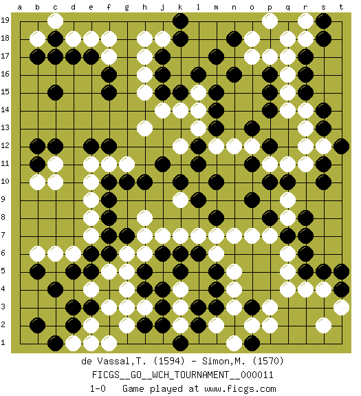 Last move : 1-0 2014 November 11 21:4:4 [Event "FICGS__GO__WCH_TOURNAMENT__000011"] [Site "FICGS"] [Date "2014.03.03"] [Round "1"] [Black "de Vassal,Thibault"] [White "Simon,Mickael"] [Result "1-0"] [Rating 1 "1594"] [Rating 2 "1570"] 1.c4 q4 2.d17 e4 3.e3 f3 4.d3 g4 5.r17 q16 6.r16 q15 7.r15 q17 8.c15 h17 9.m17 h15 10.m15 r14 11.s14 r13 12.s13 r12 13.m13 h13 14.p14 q14 15.p15 r18 16.s18 q18 17.j16 h16 18.j17 j18 19.k18 h18 20.j15 j14 21.k15 c10 22.l3 c6 23.b5 b6 24.d5 d6 25.e5 f5 26.e6 e7 27.f6 g6 28.f7 e8 29.f8 e9 30.h5 g5 31.h4 h6 32.j6 h3 33.j3 g2 34.j2 e2 35.d2 f1 36.h2 j7 37.k6 h8 38.f9 e10 39.f10 f11 40.h10 k9 41.j11 k7 42.l6 l7 43.o3 p3 44.s11 m6 45.m5 n5 46.m4 n7 47.r8 o2 48.n2 n3 49.m3 n4 50.o1 p2 51.r5 r4 52.s5 s4 53.t4 t3 54.t5 s2 55.c12 d18 56.c18 e18 57.p12 r11 58.s10 p11 59.o11 o12 60.o13 n12 61.p10 q11 62.o9 o17 63.n18 o18 64.p16 p17 65.s19 r19 66.e17 f17 67.b11 p19 68.m10 d1 69.c1 e1 70.b2 q5 71.r6 q6 72.q7 p7 73.p8 b10 74.e12 e11 75.f16 f18 76.f15 b18 77.b17 c19 78.c17 k12 79.f12 g11 80.g10 c11 81.b12 m2 82.l2 n1 83.k10 m12 84.l12 l13 85.l11 l14 86.m14 l15 87.l16 k14 88.k19 s12 89.t12 o7 90.n16 q9 91.q10 q8 92.r7 g3 93.m8 m7 94.g7 h7 95.l9 k4 96.j4 k3 97.k5 k2 98.k1 1-0 Here are the names of the openings (joseki) played in the four corners : Corner d4 : c4 e4 Komoku (Somok, Xiao~mu`) 3-4 Point. The komoku (3-4) point is the traditional corner enclosure move.. Ikken Takagakari (Hankan Nop'dakeolch'im, Yi Gaogua`jiao~, 1-Space High Approach). The 5-4 approach move has become more popular in modern times, as modern Go emphasizes speed and influence. Corner q16 : r17 q16 San-San (Sam-Sam, San-San) 3-3 Point. The San-San (3-3) point, emphasizing territory at the expense of influence. Kata-tsuki (shoulder hit). The shoulder-hit is the traditional answer to the 3-3. The direction of Black 3 depends on the positions on the side. Crawling once may be the premise for a follow-up move of sliding with a knight's move in the opposite direction. If Black plays 3 at 3-4 (to the right), the follow-on knight's move is then played at the top (e.g. 3-4, 4-5, 5-2). Black's knight's move reduces territory potential on the side it is played. Corner q4 : q4 l3 Hoshi (Hwajeom, Seongjeom, Xingwei`) 4-4 Point. The star or hoshi (4-4) point, emphasizing influence at the potential expense of territory. Player Black won this Go (weiqi, baduk) game. Follow this game move after move (download)Balance is not what players strike for, and if it does arise, it is in spite of them. (Pierre Audouard) Creativity is inventing, experimenting, growing, taking risks, breaking rules, making mistakes, and having fun. (Mary Lou Cook)