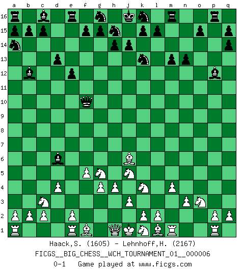 Last move : 0-1 2014 May 20 9:32:38 [Event "FICGS__BIG_CHESS__WCH_TOURNAMENT_01__000006"] [Site "FICGS"] [Date "2014.03.03"] [Round "1"] [White "Haack,Stefan"] [Black "Lehnhoff,Heinz-Georg"] [Result "0-1"] [WhiteElo "1605"] [BlackElo "2167"] 1.g2-g4 j15-k13 2.f2-f4 h16-o10 3.h3-h4 o10-o2 4.p1-o3 o2-f10 5.d2-d4 e15-e13 6.f4-f5 m15-m13 7.g1-h3 n15-n13 8.h2-j4 d15-d13 9.j2-k4 p16-q14 10.c1-q14 p15-q14 11.b1-c3 l16-q11 12.h3-j5 b16-a14 13.n2-n3 e13-e12 14.m2-m4 q16-p16 15.q1-p1 f16-b12 16.j4-g5 q11-p12 17.o1-j6 o16-d6 0-1 This big chess game has been lost on time (started : 2014.03.03 19:34:3) Follow this game move after move (download)Fischer is the strongest player in the world. In fact, the strongest player who ever lived. (Larry Evans) Im Reiche der Wirklichkeit ist man nie so glücklich wie im Reiche der Gedanken. (Arthur Schopenhauer) Siempre es mucho mejor sacrificar las piezas de tu oponente. (Savielly Tartakover) Les échecs sont plus proches de l'art de l'assassinat que de l'art de la guerre. (Arturo Perez-Reverte) For to win one hundred victories in one hundred battles is not the acme of skill. To subdue the enemy without fighting is the acme of skill. (Sun Tzu)
