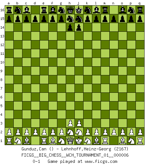 Last move : 0-1 2014 April 3 7:9:42 [Event "FICGS__BIG_CHESS__WCH_TOURNAMENT_01__000006"] [Site "FICGS"] [Date "2014.03.03"] [Round "1"] [White "Gunduz,Can"] [Black "Lehnhoff,Heinz-Georg"] [Result "0-1"] [WhiteElo ""] [BlackElo "2167"] 0-1 This big chess game has been lost on time (started : 2014.03.03 19:34:3) Follow this game move after move (download)In Chess, as it is played by masters, chance is practically eliminated. (Emanuel Lasker) Privat ist Kortschnoi kein schlechter Mensch, sehr sympathisch. Aber während des Spiels ist er grausam. Er will dich töten. (Miguel Najdorf) Una victoria por una combinación errónea, aunque sea espectacular, me llena de horror artístico. (Wilhelm Steinitz) Aux échecs, l'amour-propre est satisfait quand on remporte la victoire, mais il n'y a pas de honte à être battu. (Benjamin Franklin) A woman without a man is like a fish without a bicycle. (Gloria Steinem)