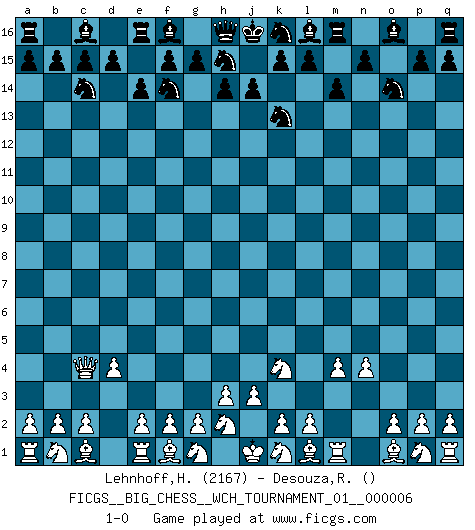 Last move : 1-0 2014 April 18 8:3:57 [Event "FICGS__BIG_CHESS__WCH_TOURNAMENT_01__000006"] [Site "FICGS"] [Date "2014.03.03"] [Round "1"] [White "Lehnhoff,Heinz-Georg"] [Black "Desouza,Romeo"] [Result "1-0"] [WhiteElo "2167"] [BlackElo ""] 1.j2-k4 g16-f14 2.h1-o7 e15-e14 3.o7-o15 p16-o14 4.o15-c4 b16-c14 5.m2-m4 j15-k13 6.d2-d4 m15-m14 7.n2-n4 1-0 This big chess game has been lost on time (started : 2014.03.03 19:34:3) Follow this game move after move (download)The isolated Pawn casts gloom over the entire chessboard. (Aaron Nimzovich) Das Schachspiel ist ein See, in welchem eine Mücke baden und ein Elefant ertrinken kann. (Emanuel Lasker) Hasta este punto, las blancas han seguido un análisis bien conocido. Pero ahora el hace un error fatal: empieza a usar su propia cabeza. (Siegbert Tarrasch) C'est une question de caractère, Beaucoup de gens perdent leur motivation très vite. D'autres, ils sont rares, peuvent la conserver très longtemps. J'aime les échecs, encore aujourd'hui je suis heureux d'analyser des parties. J'aime toujours gagner, je déteste encore perdre. Bien jouer est important pour mon intégrité intellectuelle et morale. Et puis les échecs vivent en ce moment une période historique grâce à Internet. Ils se développent dans les systèmes éducatifs à travers le monde. Ils sortent de leur ghetto, et c'est mon rôle de mener à bien cette révolution. (Gary Kasparov) Lamb in skin of tiger, still fears the wolf. (Chinese proverb)