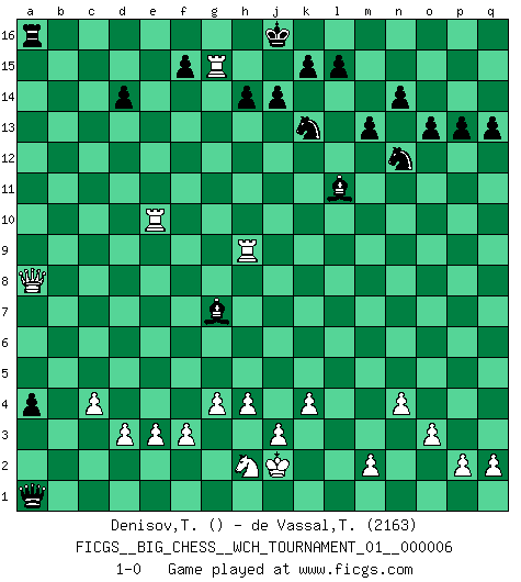 Last move : 1-0 2015 February 6 20:34:16 [Event "FICGS__BIG_CHESS__WCH_TOURNAMENT_01__000006"] [Site "FICGS"] [Date "2014.03.03"] [Round "1"] [White "Denisov,Timofey"] [Black "de Vassal,Thibault"] [Result "1-0"] [WhiteElo ""] [BlackElo "2163"] 1.j2-h4 h15-g13 2.n2-n4 j15-k13 3.h1-o7 m15-m13 4.d2-d3 p16-o14 5.c1-l9 k16-h15 6.o7-j7 h16-m12 7.b1-c3 m12-m6 8.o1-h7 m6-b6 9.c3-e4 b6-b2 10.c2-c4 b16-c14 11.g1-j2 e15-e13 12.a1-b1 b2-a2 13.b1-b9 a2-a8 14.e1-b1 b15-b14 15.b1-b8 a8-c6 16.j7-j8 g16-j15 17.o2-o3 f16-c13 18.b9-h9 c16-b15 19.h9-d9 d15-d14 20.e4-g5 c14-a13 21.j8-k9 e16-e14 22.p1-n2 p15-p14 23.n2-l3 c6-c7 24.k9-l8 l16-p12 25.l8-g8 e14-f14 26.f2-f3 o16-p15 27.b8-b9 q15-q13 28.g2-g4 o14-n12 29.l9-k8 n15-n14 30.l3-j4 m16-m14 31.j4-h6 m14-l14 32.h4-j6 b15-e12 33.b9-c9 c7-j13 34.g5-f7 a13-b11 35.c9-c11 b11-d12 36.f7-h8 e12-c14 37.d9-o9 o15-o13 38.k1-l3 c14-b13 39.g8-h9 b13-c14 40.h9-e6 d12-b13 41.c11-c8 a15-a14 42.l3-j4 j13-h13 43.e6-g8 l14-l8 44.h8-j10 h13-k11 45.j4-k6 c13-k6 46.c8-c14 k6-c13 47.o9-a9 b13-d12 48.c14-c15 g13-e14 49.c15-d15 a14-a13 50.a9-k9 k11-b11 51.j10-g11 b11-a12 52.g8-j8 a16-b16 53.d15-a15 f14-f11 54.k9-g9 h15-g13 55.g9-g8 a12-e16 56.h7-g6 d12-c14 57.g6-c10 j16-h16 58.c10-a12 b14-b13 59.a12-d9 f11-g11 60.g8-g11 c13-a15 61.j2-h4 c14-d12 62.f1-g2 e16-c14 63.j8-g6 c14-c7 64.d9-g12 l8-l12 65.g12-j10 l12-j12 66.j10-k11 j12-j6 67.h4-j6 p12-j6 68.h6-f7 j6-c12 69.g11-g9 c12-b11 70.e2-e3 d12-e10 71.g9-p9 e10-d8 72.g6-g11 b11-f7 73.k11-f7 c7-f7 74.g11-d8 a15-c13 75.h3-h4 p14-p13 76.d8-j8 f7-l2 77.g2-j4 l2-l13 78.p9-l9 p15-l11 79.k2-k4 a13-a12 80.l1-k2 l13-a3 81.m1-l1 h16-h15 82.j4-g6 a12-a11 83.l9-d9 a11-a10 84.j1-j2 b13-b12 85.l1-l10 e14-d12 86.q1-l1 b16-a16 87.l1-l9 a10-a9 88.k2-m4 a16-a15 89.k8-f4 q16-a16 90.m4-g9 a3-a1 91.l9-h9 b12-b11 92.f4-j7 c13-b12 93.d9-f9 a9-a8 94.g6-b11 a8-a7 95.b11-e8 a7-a6 96.g9-e11 g13-f11 97.f9-f11 a6-a5 98.f11-g11 b12-g7 99.e11-d12 e13-d12 100.j7-d12 a5-a4 101.g11-g15 h15-j16 102.d12-a15 a16-a15 103.l10-e10 a15-a16 104.e8-k13 j15-k13 105.j8-a8 1-0 Follow this game move after move (download)Adequate compensation for a sacrifice is having a sound combination leading to a winning position; adequate compensation for a blunder is having your opponent snatch defeat from the jaws of victory. (Bruce A. Moon) Irgendwie scheint mir sonntags früh um 9 Uhr der Killerinstinkt verloren gegangen zu sein. (Alexej Shirov) La esencia del Ajedrez es pensar acerca de lo que el Ajedrez es. (David Bronstein) Les pièces de l'échiquier étaient impitoyables. Elles le retenaient, elles l'absorbaient. Il y avait de l'horreur en cela, mais aussi une harmonie unique. Car, qu'y a-t-il dans le monde, à part les échecs ? (V. Nabokov) The quality of decision is like the well-timed swoop of a falcon which enables it to strike and destroy its victim. (Sun Tzu)